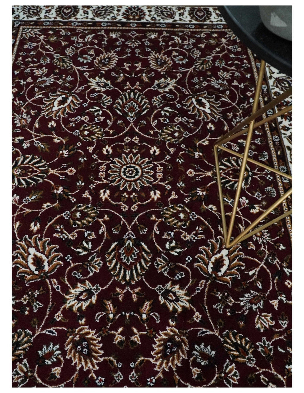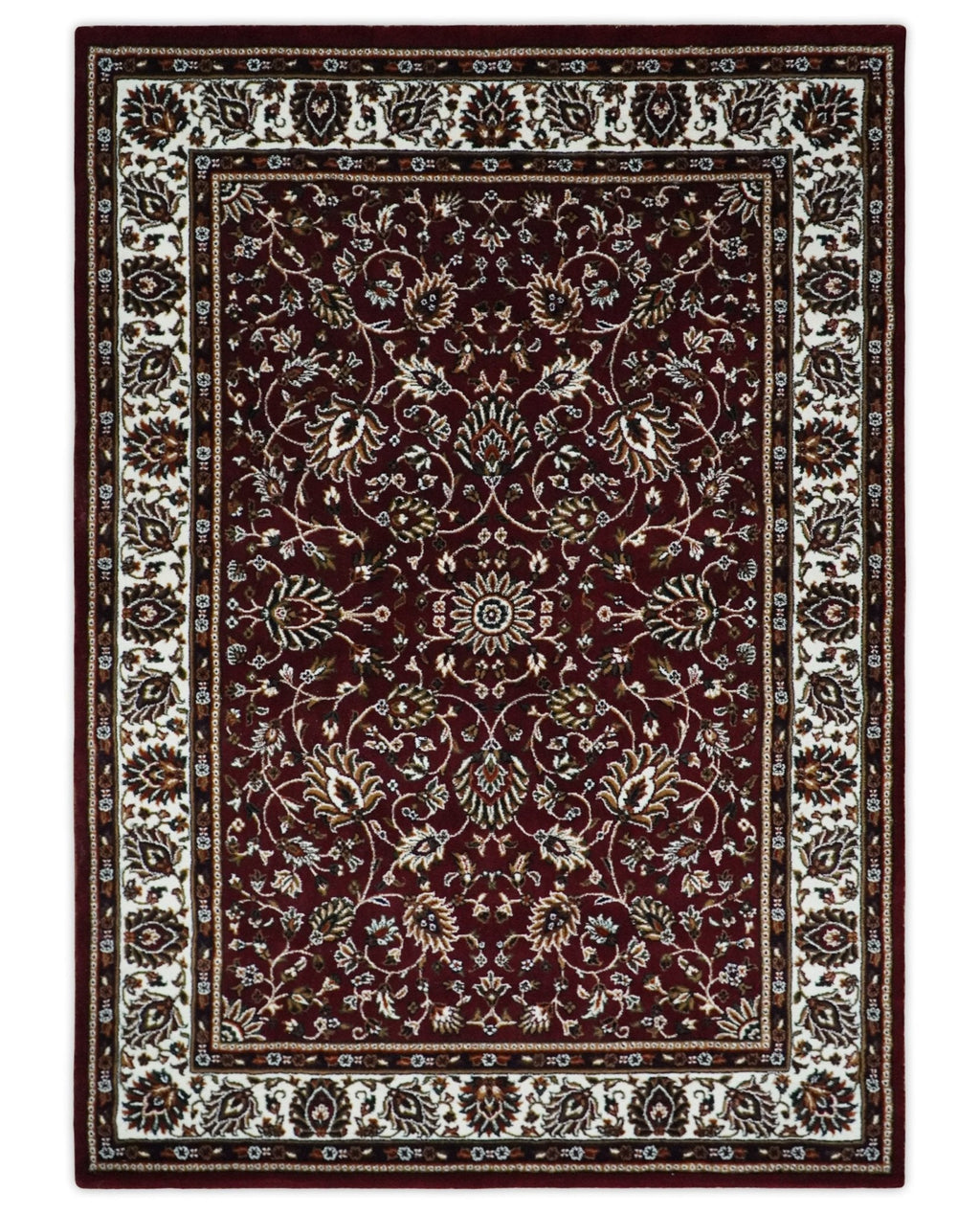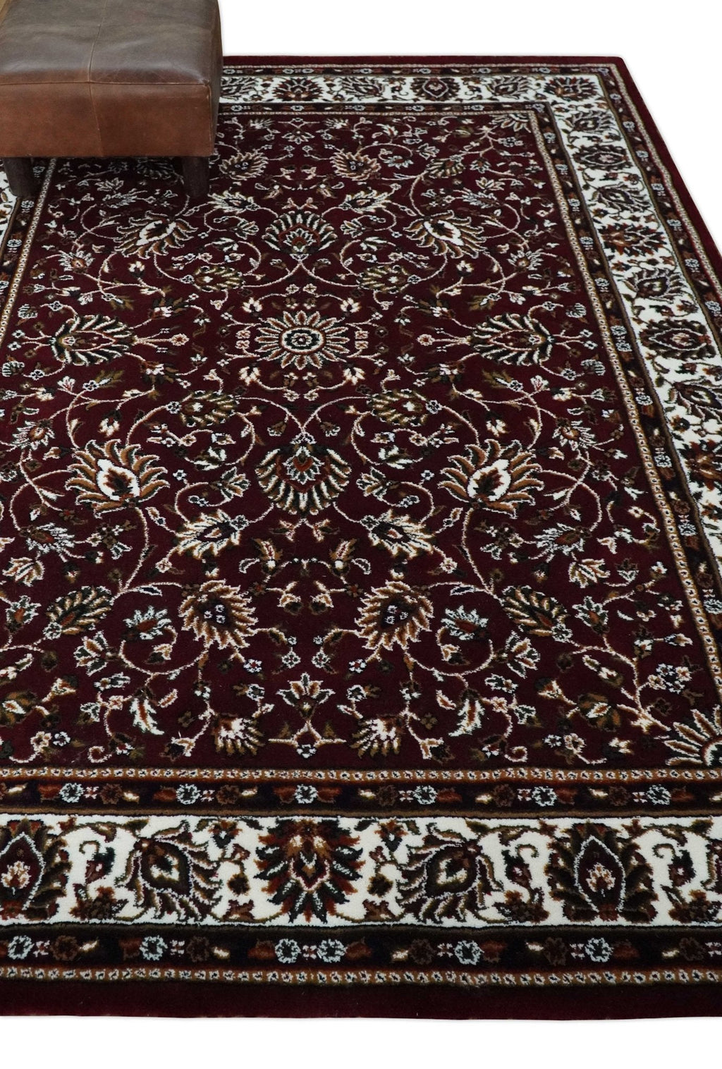 This Premium Look 5x7 area rug is machine-woven from polyester. The traditional pattern design in maroon and ivory brings a timeless elegance to any room. Durable and stylish, it's the perfect way to instantly upgrade any home.