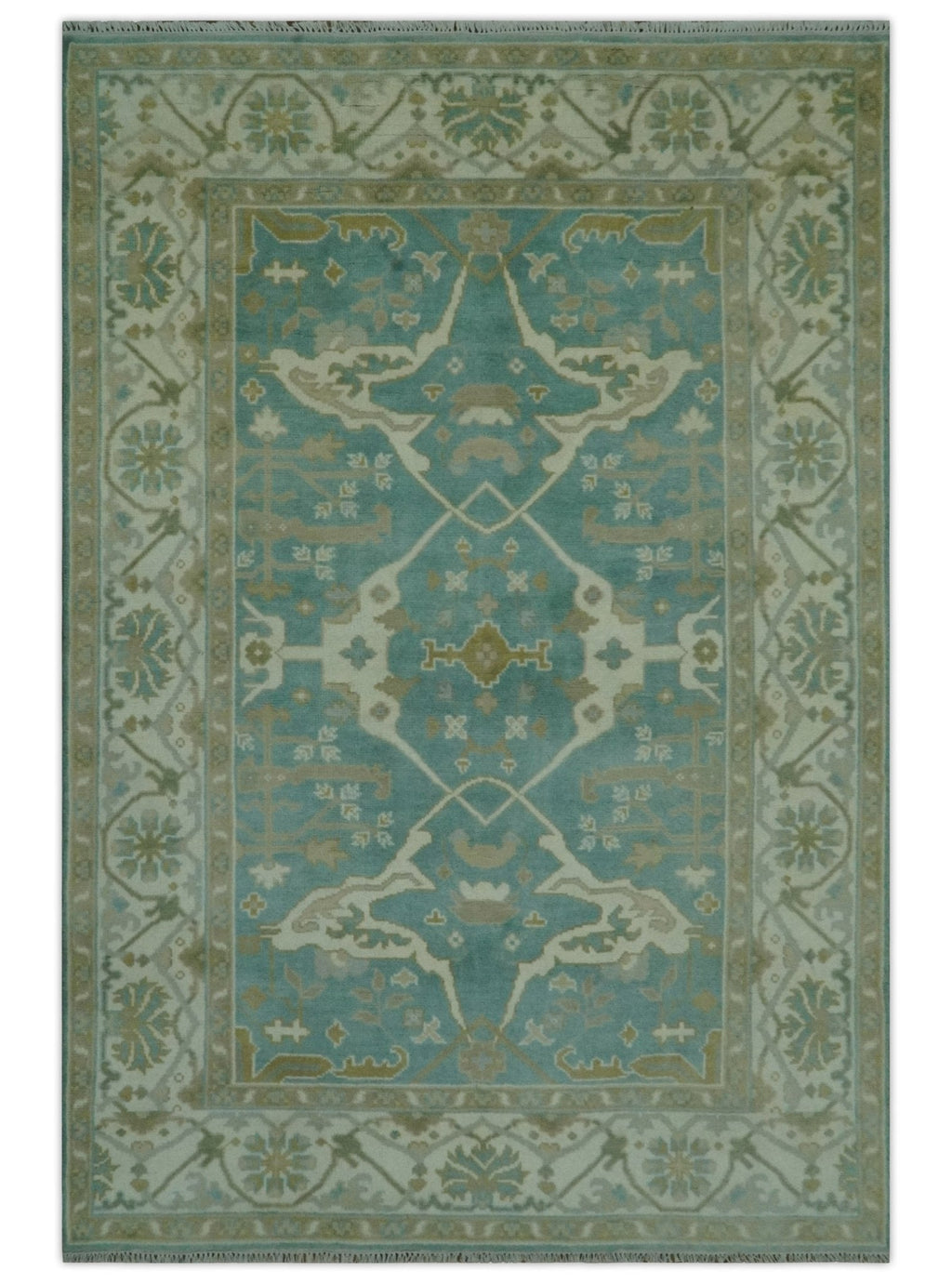 Teal and Ivory Hand Knotted Traditional Oriental Oushak 6x9 wool rug