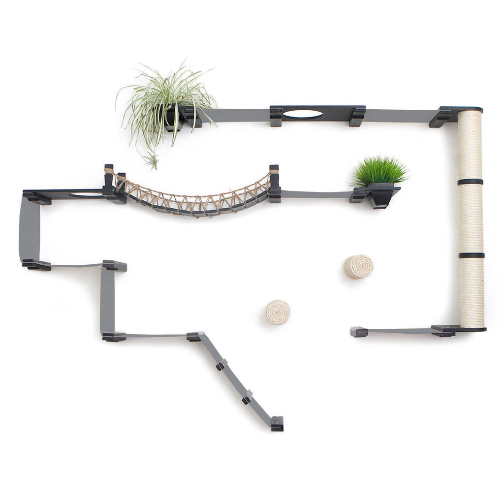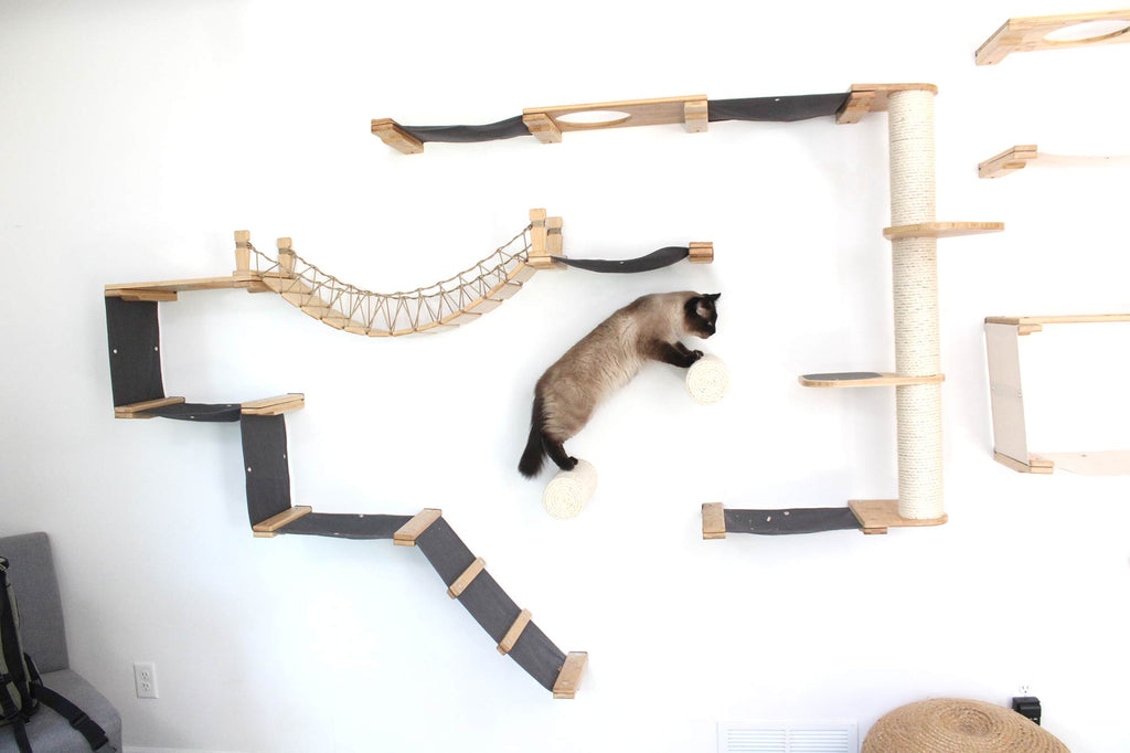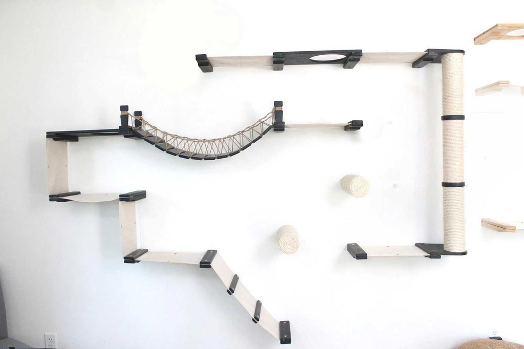 This Luxury Cat Tree is a compilation of almost every wall-mounted cat furniture concept we offer! Although some people prefer to get individual items and use the modular furniture to create their own DIY cat wall playground, the Juggernaut is for those who are looking for the full monte, already designed and ready to install. It includes multiple Hammocks, a Scratching Pole, and a Bridge connecting both sides together. This wall-mounted cat tree is a great option for homes with multiple cats or large cats, not only due to its large size but also because it offers multiple routes throughout the layout. Most cats don’t like to be cornered or feel like they are in a position where they cannot make a quick escape, so a layout like the Juggernaut can help your cat feel at ease.