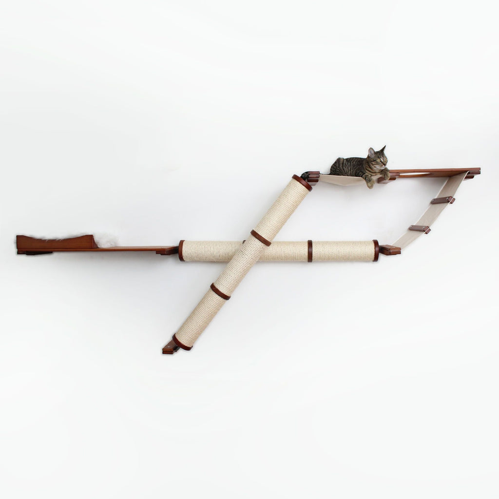 The Plateau is a wide Cat Condo with a unique selection of features. This cat wall incorporates two different Scratching Pole configurations which will please all types of cat scratching behaviors. Whether your cat is a horizontal or vertical scratcher, they will definitely be able to sharpen their claws and get a big stretch on the Angled or Horizontal Pole. This structure also includes a 34” Shelf with a Nest for somewhere plush and cozy to curl up. With multiple levels to play vertically, and a wide span to traverse across, the Plateau will take your cat’s activity levels to new heights!