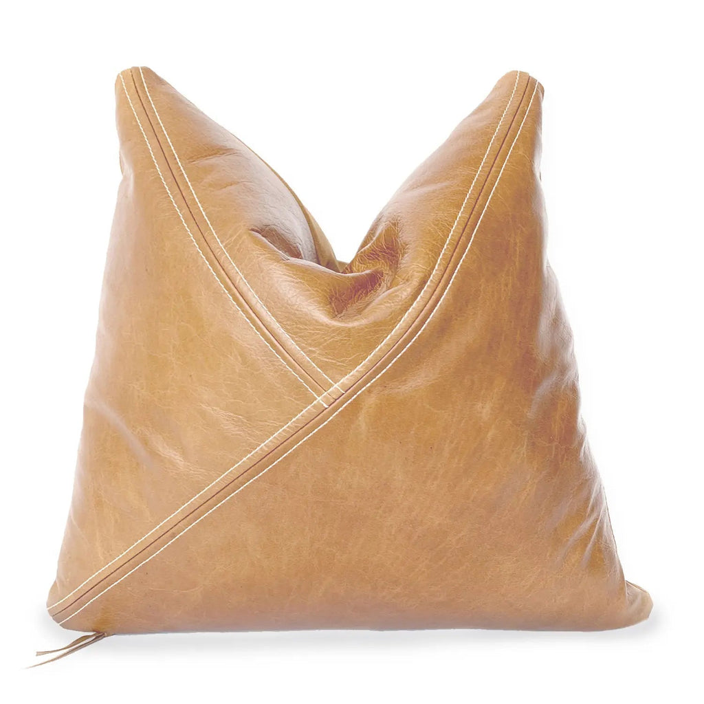 Upgrade your living space with our 18x18" our signature genuine leather accent pillow, featuring a detailed triangle design and detailed contrast top stitching. This sophisticated and versatile accent piece seamlessly blends luxury and style, adding a modern yet timeless touch to any decor. Handcrafted from premium full-grain leather, this pillow exudes warmth, durability, and craftsmanship. The rich leather patina only gets better with time, making it a perfect choice for living rooms, bedrooms, or office spaces.