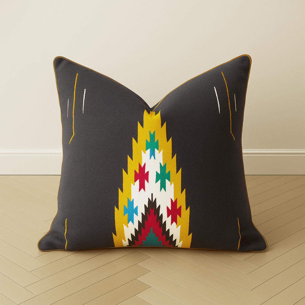 Black, yellow, red accent this leather trimmed decorative pillow. Perfect for men's decor or a playful bedroom- our Navajo style southwestern wool textiles are the perfect accent pillow for any living room or bedroom update. Real leather piping around the edge creates a sophisticated masculine vibe that is soft enough for a feminine room.