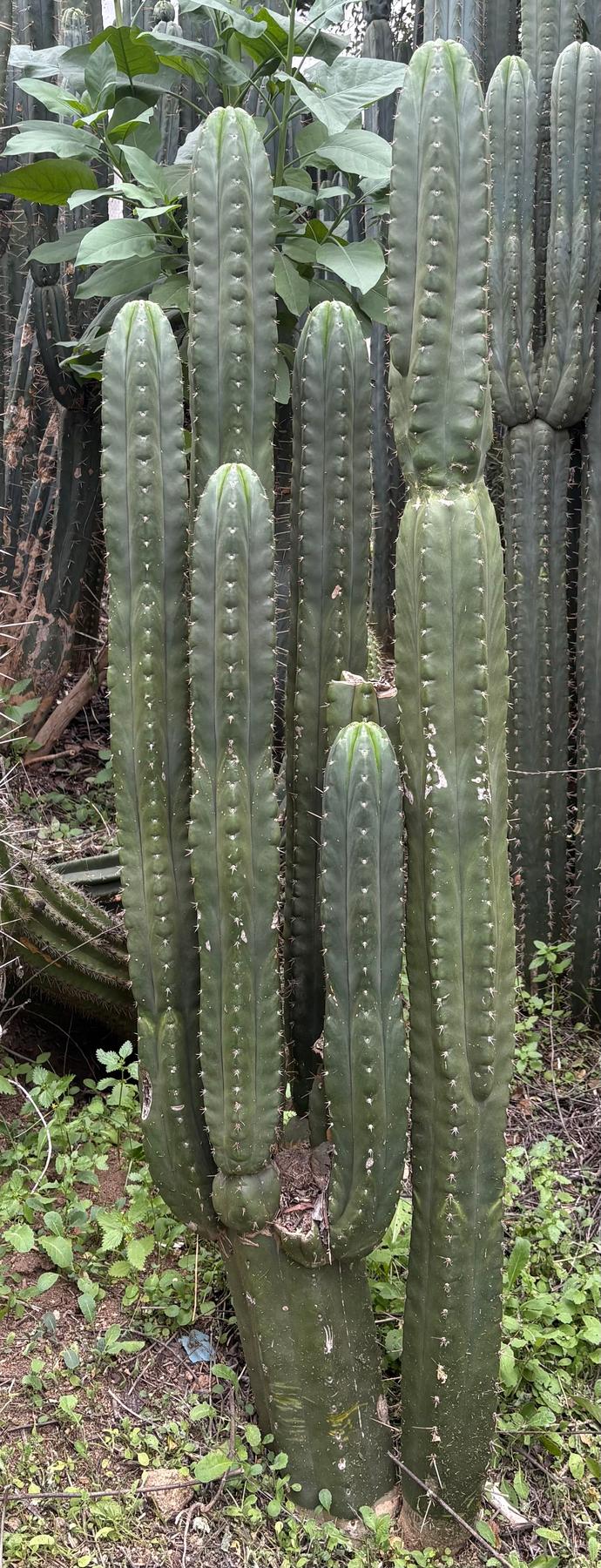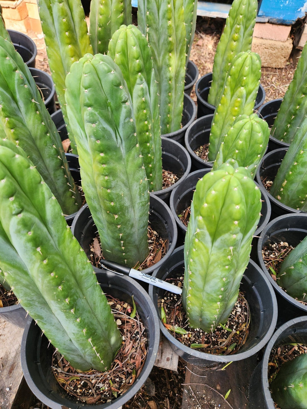 Trichocereus Pachanoi ECK, a local older stand of cactus I found a few years ago, these boys grow big!!. Beautiful dark green coloring, also tend to show a pretty bluish glaucus, and single longer spine. Potted in a 1 gallon containers as well as cutting options. ready new homes!