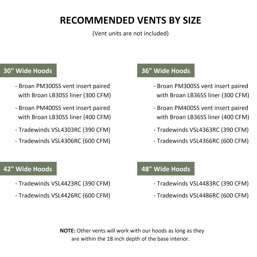 - Broan PM400SS paired with Broan LB30SS (400 CFM)