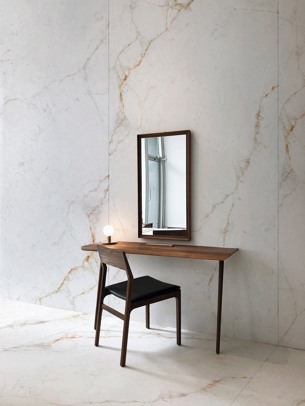 The inspiration for this model comes from classic white marble; in this case, featuring golden grayish veins on an off-white background. It’s offered in Décor Polished and Silk finishes. This last finish simulates the effect of an eroded surface in line with a golden vein design for a more natural look.