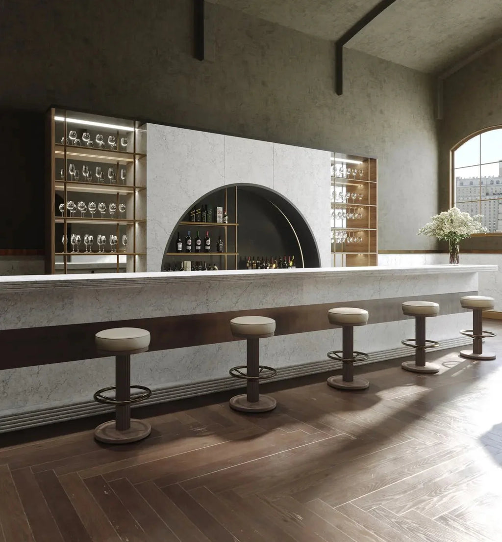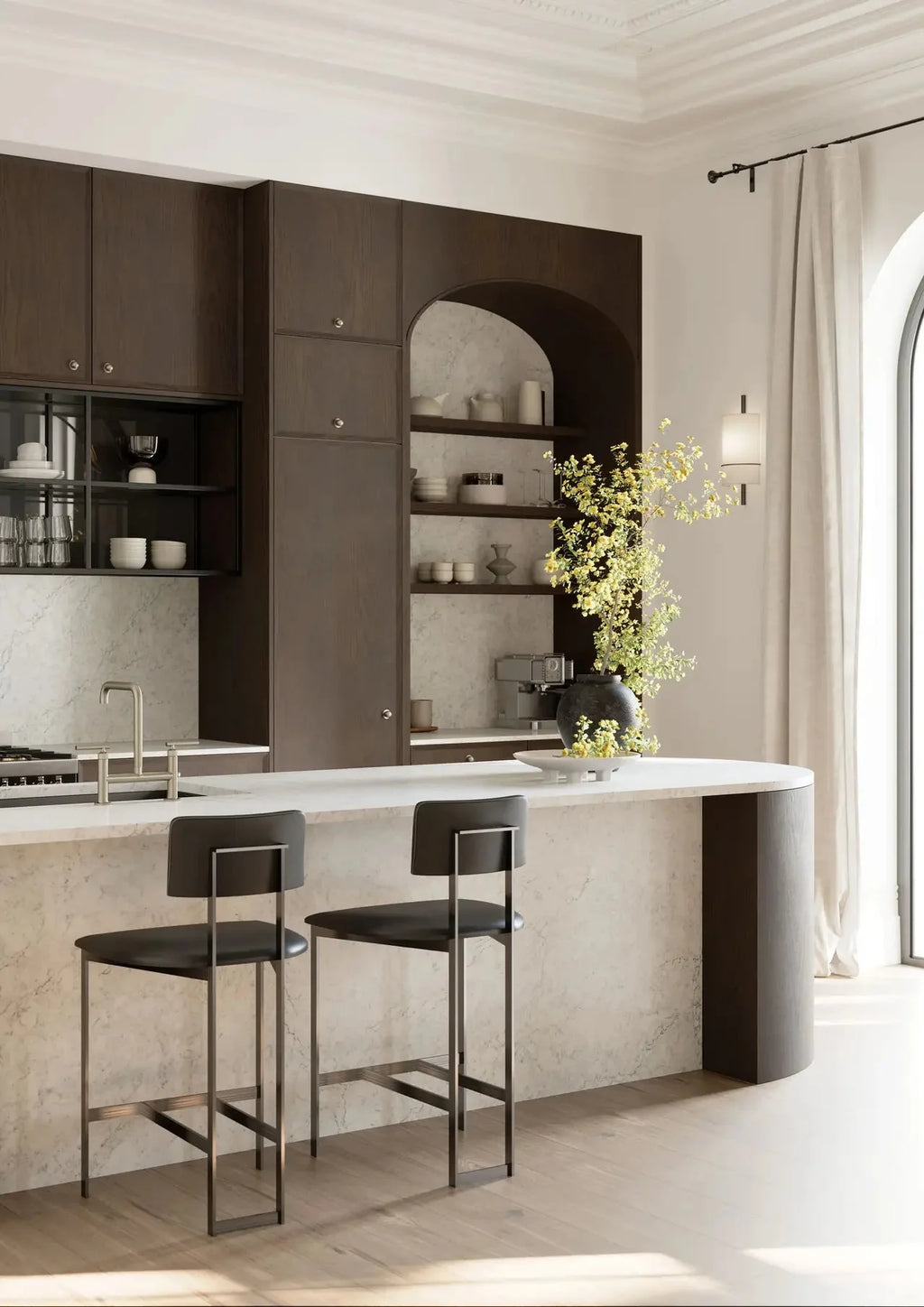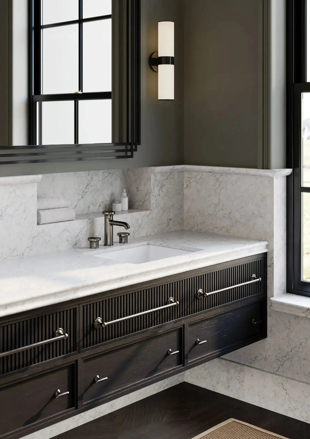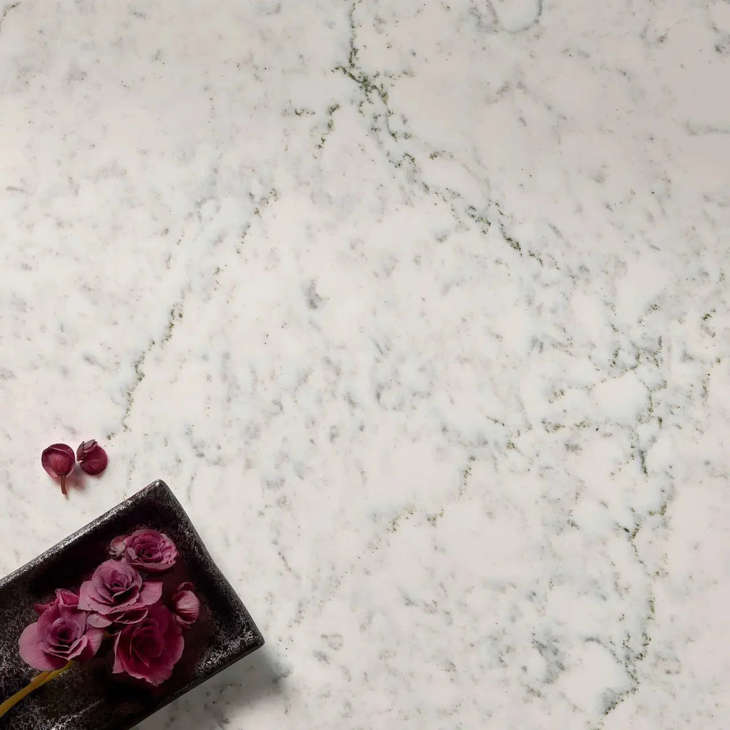 Avalene Cambria boasts a chic white backdrop infused with sophisticated charcoal marbling and mesmerizing shades of gray, accented by delicate emerald veins that weave throughout. Avalene Cambria presents a striking combination of cool whites and deep greens, producing an elegant, one-of-a-kind effect on your kitchen island.