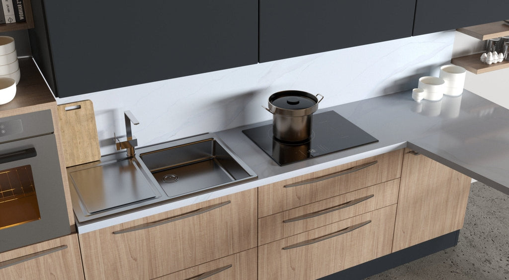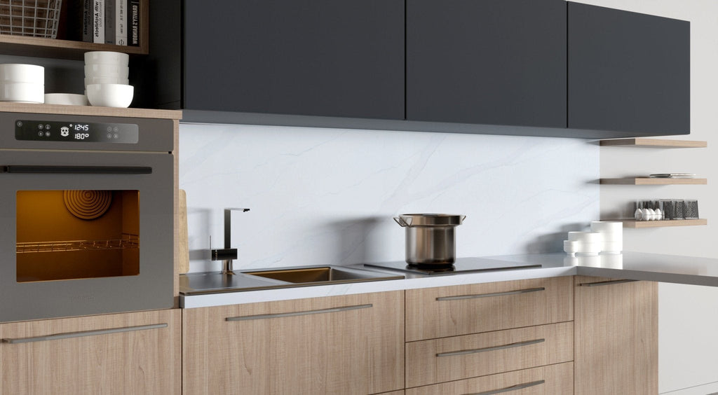 The exquisite Vicostone Bettoglio™ captures the essence and elegance of natural Calacatta marble from Italy, with delicate neutral light gray veins blending perfectly with a warm white backdrop.