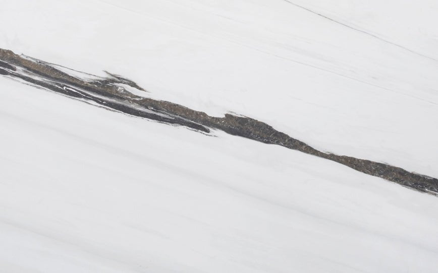 Bianco Lasa Macchia Vecchia Tech is the real essence of large format porcelain stone. Characterized by a white background with a natural black stripe to contrast, this stone adds strong personality to wall spaces, flooring, and more. Available in Polished and Matte finish.