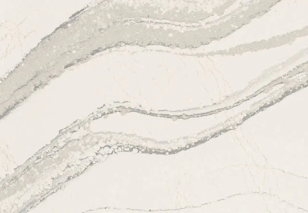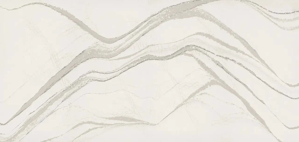 Brittanicca offers a creamy marbled background of neutral white that provides a stage on which gray islands and peninsulas meander among intertwining ashen veins dotted with veiled charcoal speckles.