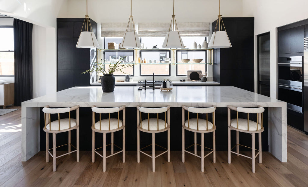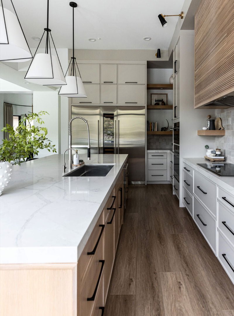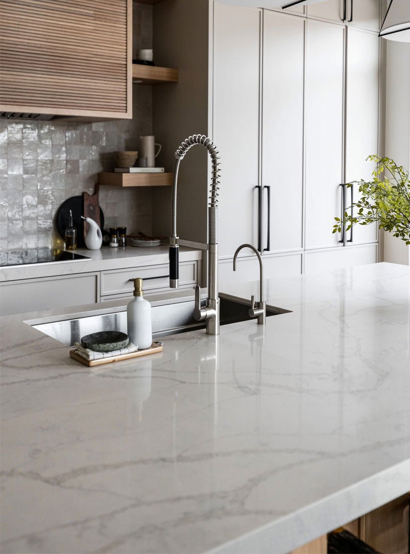 Quartzite-inspired quartz, featuring an off-white and grey background with bold, dynamic grey veining. The reef’s patterns as viewed from above were our muse for Calacatta Fresco’s complex vein formations. We recreated something of the burstlike pattern, formed over thousands of years, at the same time brimming with life and timelessly still. Hues of greys and off-white recreate the gentle play of light on the water and restful shades of the vast, clear ocean. We hope Calacatta Fresco’s clean aesthetic and dynamic shapes will instill something of the Great Barrier Reef’s lively elegance to your design.