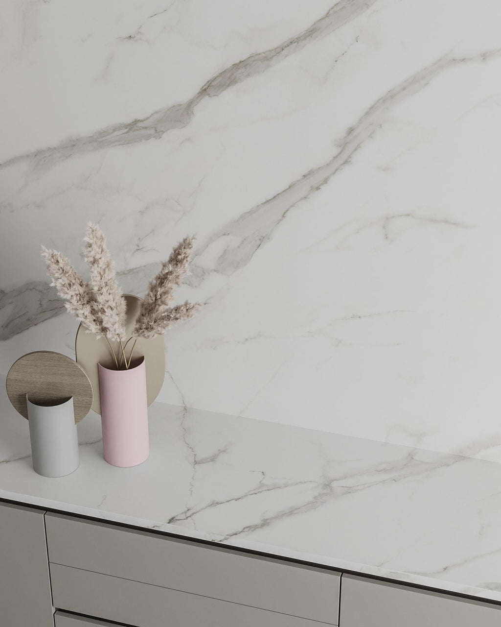 Laminam Calacatta Oro Venato captures the luxurious essence of Calacatta marble, enhanced with rich, golden veins that flow gracefully across a luminous white surface. The warm, golden hues add a touch of opulence, creating a striking contrast against the pure white background. This surface is ideal for those seeking to infuse their spaces with timeless elegance and a sense of grandeur.