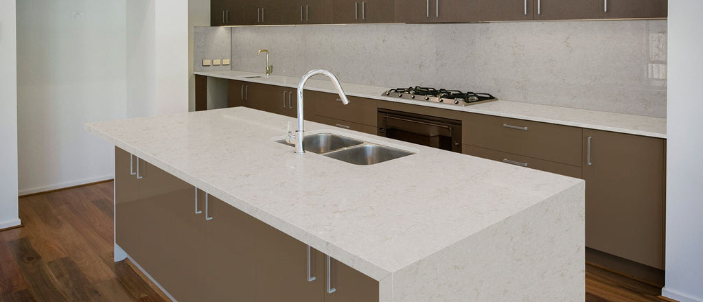 Cashmere Taj features a soft, creamy background and bronze and gold Carrara veining, evoking the look of natural stone. Chic and sophisticated, this gorgeous, on-trend quartz is strong, durable, and easy to maintain, making it the perfect addition to residential and commercial spaces. Use this attractive surface solution to create beautiful countertops, waterfall islands, and accent walls.