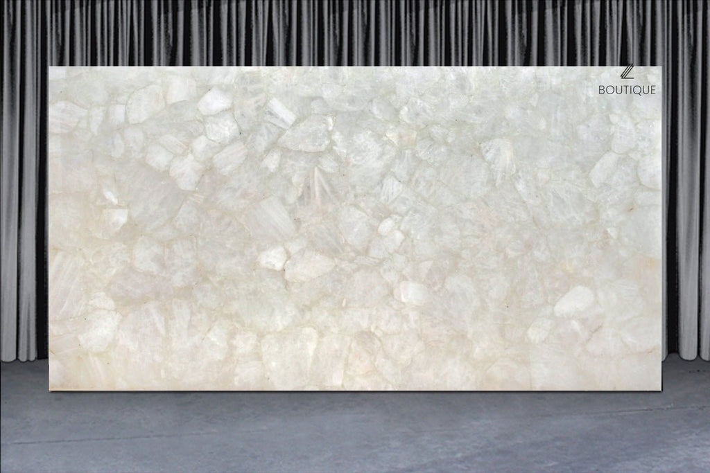Classic White Quartz gemstone slabs are renowned for their pristine beauty and timeless elegance. Made from natural quartz, these slabs feature a crisp white background with subtle veining or crystal-like patterns, making them a versatile and sophisticated choice for various interior applications. Their clean, minimalist look enhances any space with a touch of modern luxury.