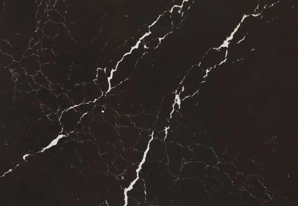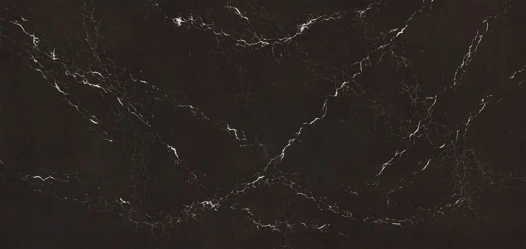 Delamere Cambria is a clean, neutral design, contrasting white veins float diagonally across a soft, almost charcoal, chocolate brown background. Lighter, softer white lines intersect with the bolder diagonals.