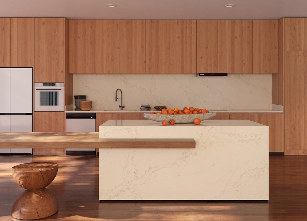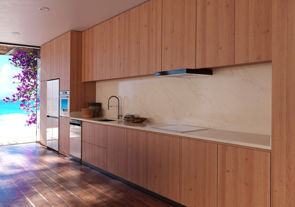 Bring some serious brightness to your space with the soft and effortless base of Emanato Vicostone. Its alluring golden threads, ranging from creamy beiges to gentle taupe, will captivate and illuminate in a mesmerizing display.