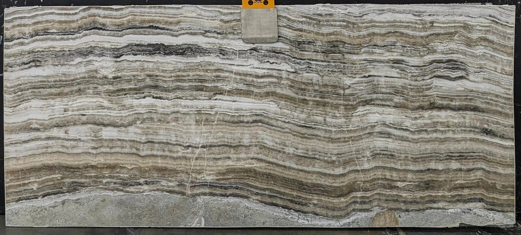 A grand onyx, expertly sliced to display vibrant layers of translucent hues, from gold and silver to a deep blue grey. The mix of warm and cool tones, along with the striking veining, make this slab perfect for both vertical and horizontal applications.