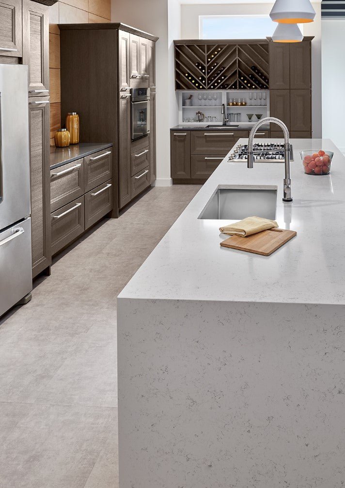 Wilsonart Haida is a bright white quartz countertop design with fine short black veining resembling a carrara marble look.