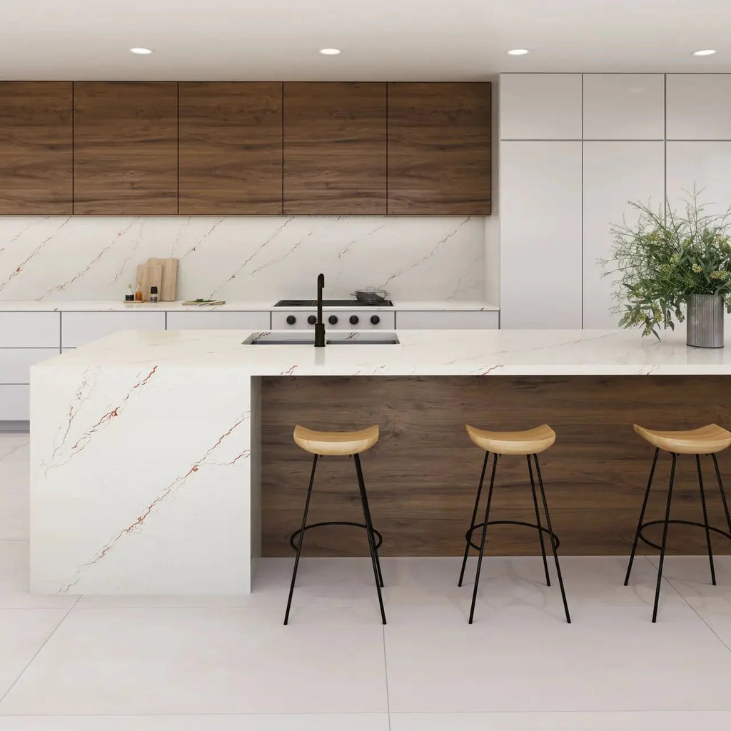 Deep bronze veins with rosy undertones fracture a cool white canvas with vibrant intensity. Debossed veins contrast a smooth surface, creating a wonderfully organic design with a gently textured appeal.