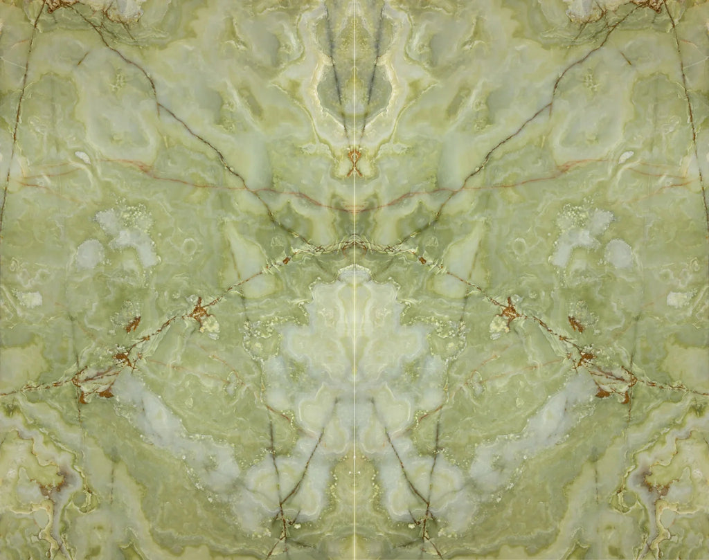 Marvel at the stunning flow of this sought-after onyx from Afghanistan. Its shifting greens, ranging from pale pistachio to key lime to peridot, are accented by bold veins of blood orange, rose gold, and terracotta that seem to dance across the surface and dive into the stone's depths.