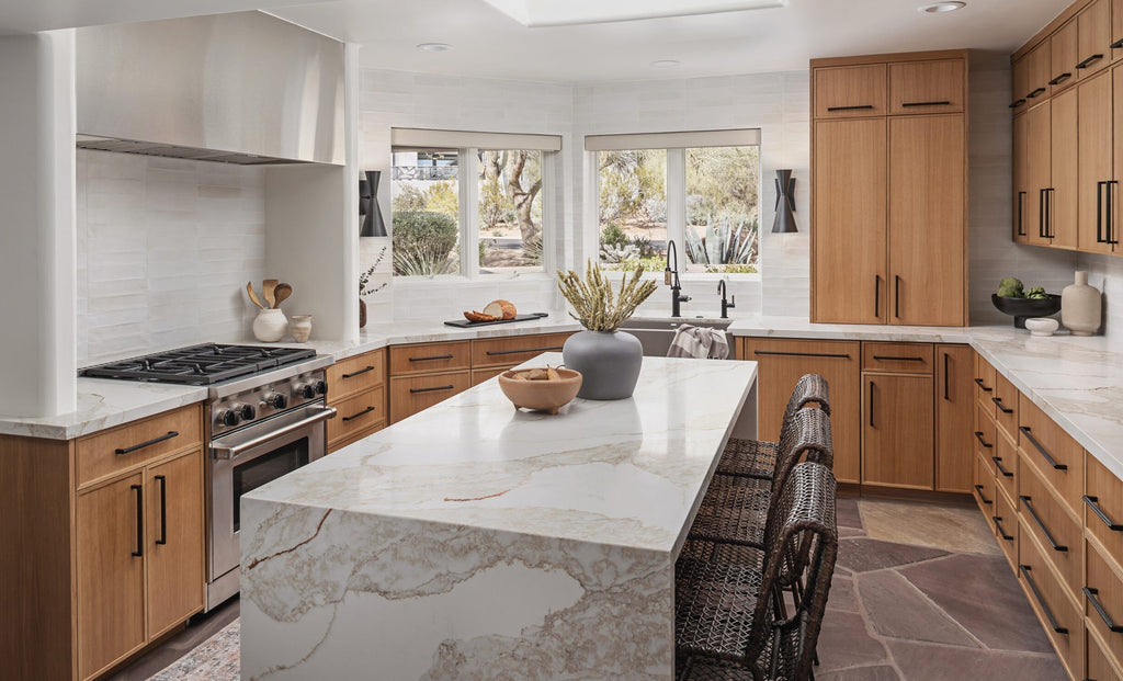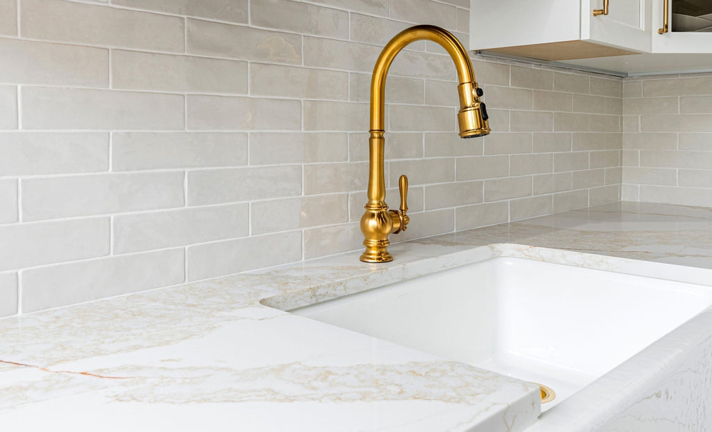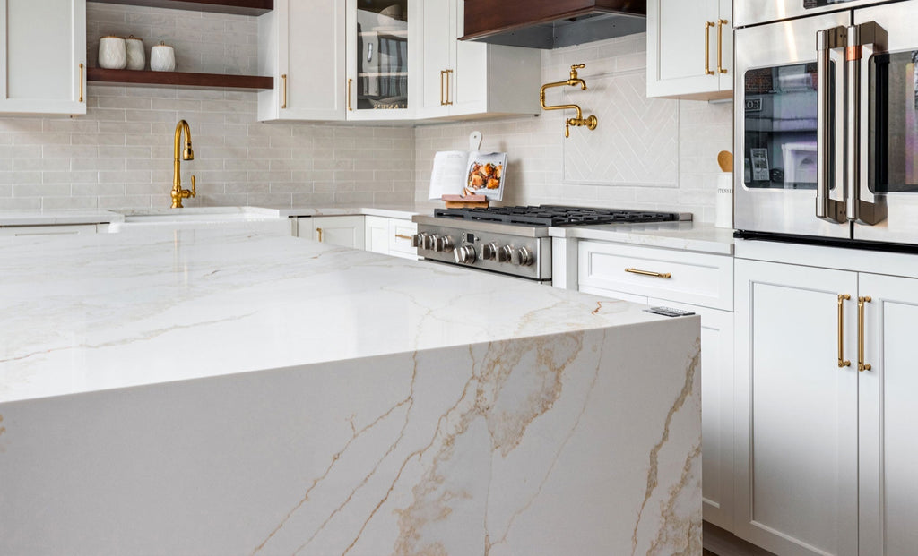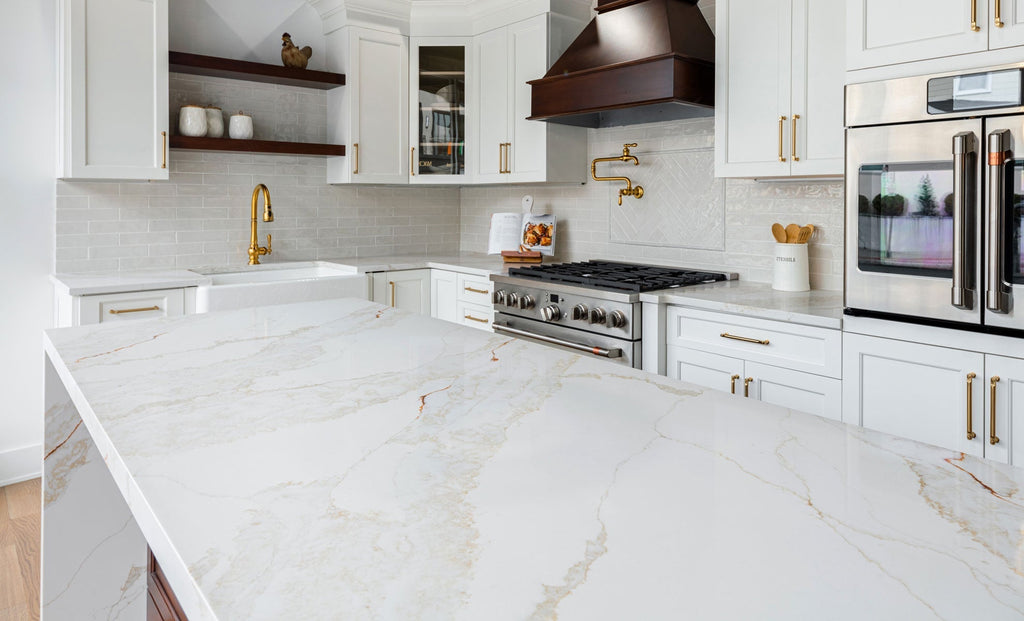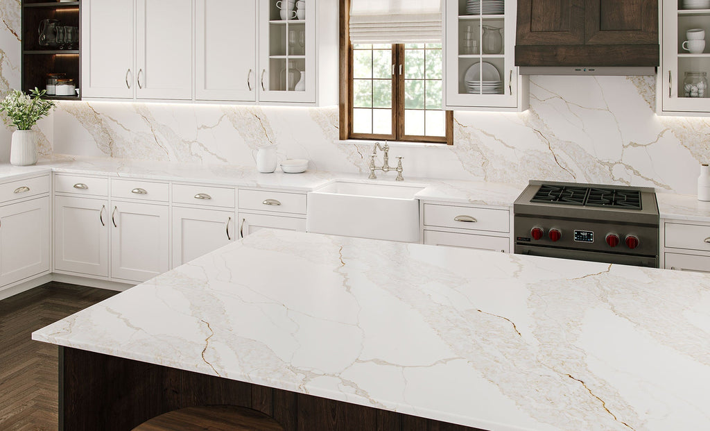 Macchia Vecchia Calacatta marble-inspired quartz, featuring a white background with bold dynamic brown and rust veining. Moon Valley’s soft, off-white background and warm, wide veins tipped with gentle shades of rust and gold pay homage to this ethereal scene, lit by the luna glow — the still of the desert, the warmth of the sand and the luminous moon. Subtle shading, and craggy grooves bring a sense of desert still and ancient wonder to your space.