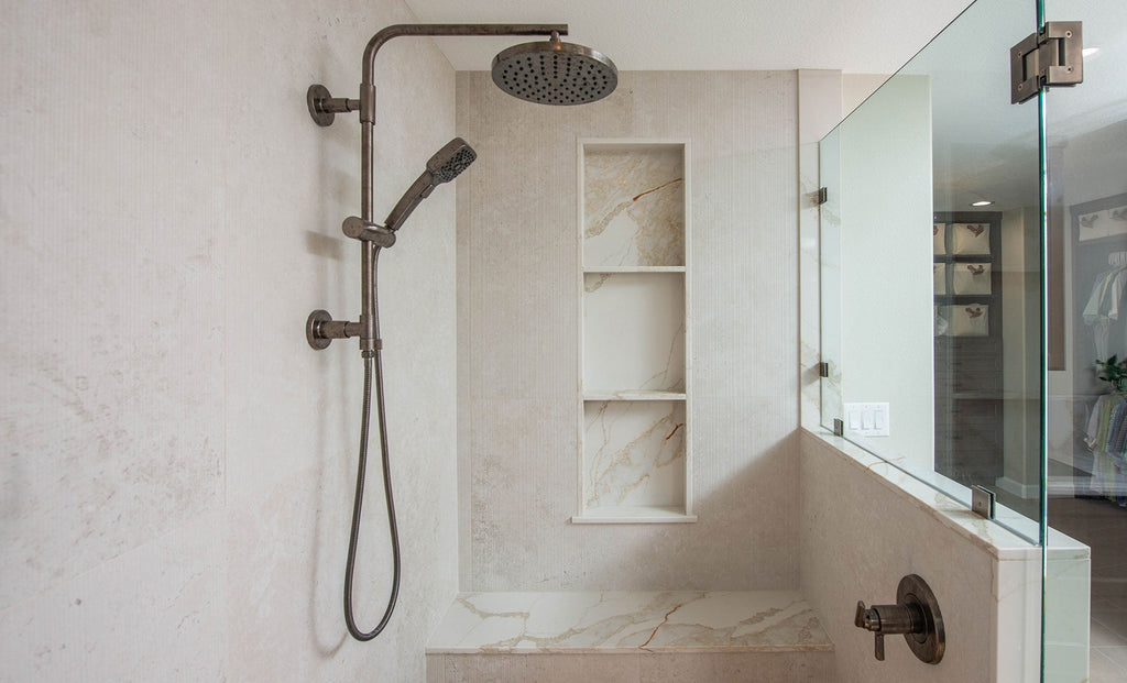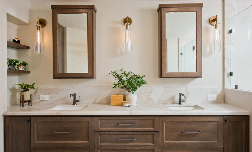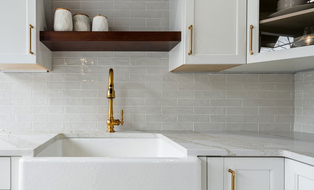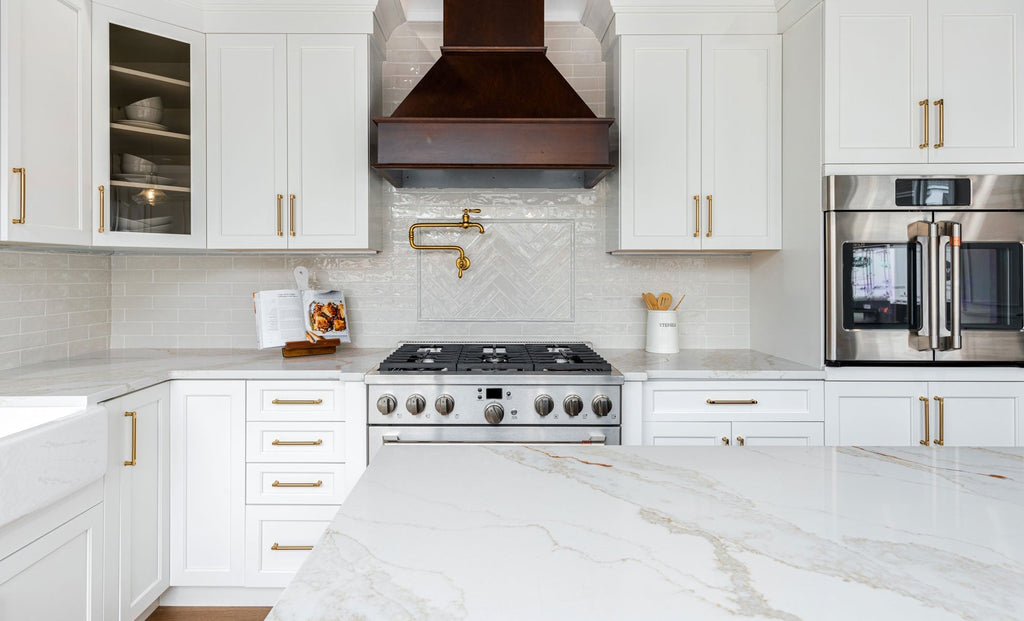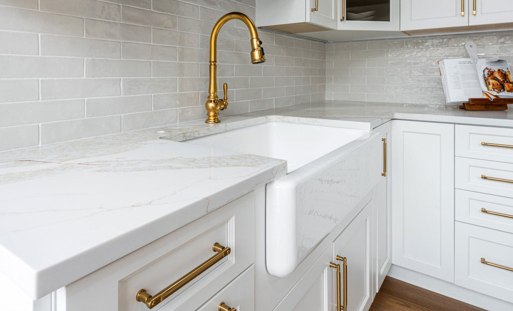 Macchia Vecchia Calacatta marble-inspired quartz, featuring a white background with bold dynamic brown and rust veining. Moon Valley’s soft, off-white background and warm, wide veins tipped with gentle shades of rust and gold pay homage to this ethereal scene, lit by the luna glow — the still of the desert, the warmth of the sand and the luminous moon. Subtle shading, and craggy grooves bring a sense of desert still and ancient wonder to your space.