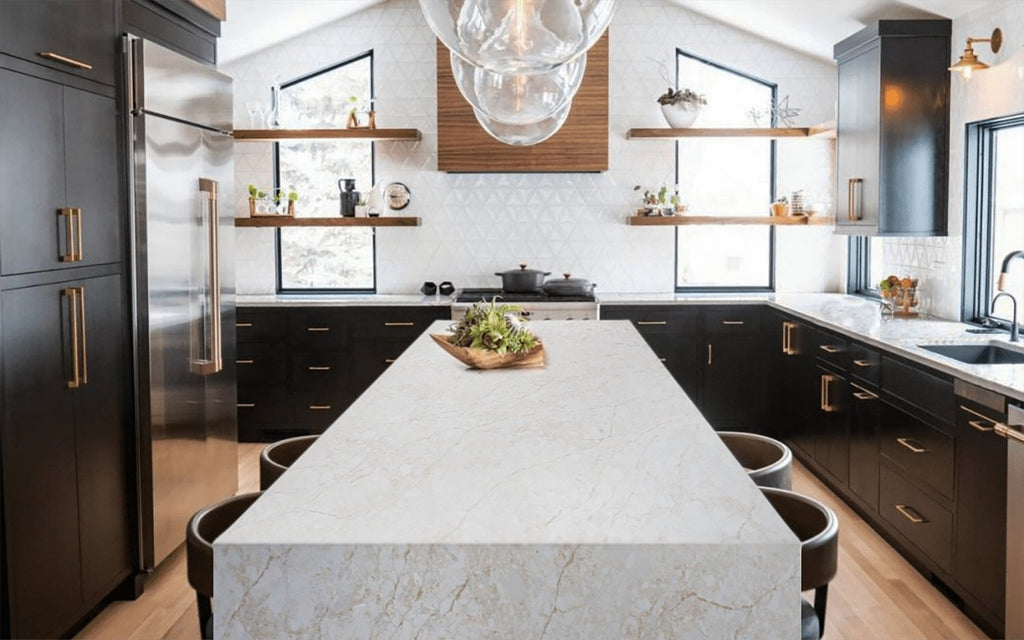 Emerstone Naica is a stunning quartz surface that emulates the timeless beauty of Taj Mahal marble. Featuring a soft, creamy white base adorned with delicate, flowing veins in warm beige and subtle gray, Naica creates an inviting and sophisticated atmosphere in any space