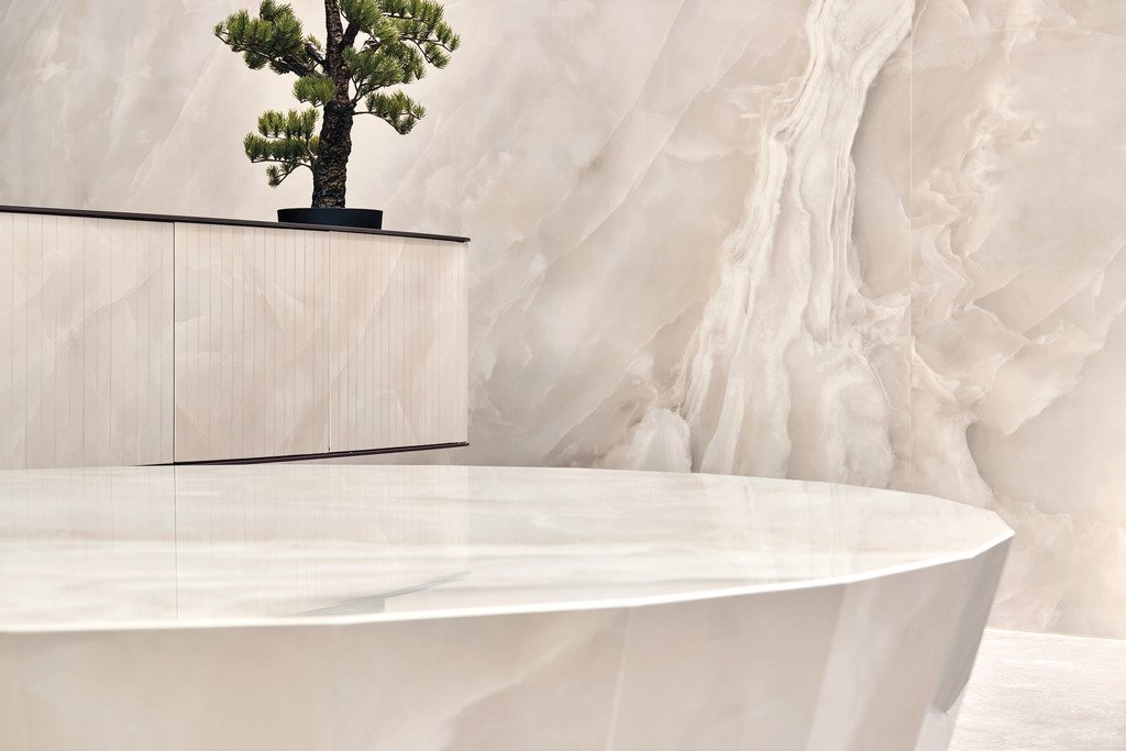 Onice Pesca, also known as Peach Onyx, is a stunning natural stone prized for its warm, peachy tones and translucent quality. With delicate veining and subtle variations in color, Onice Pesca exudes elegance and sophistication, making it a popular choice for luxurious interior design projects.