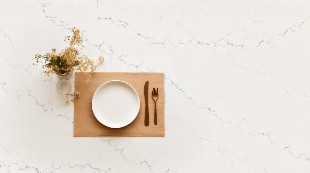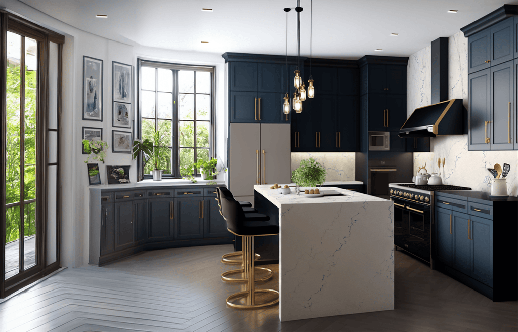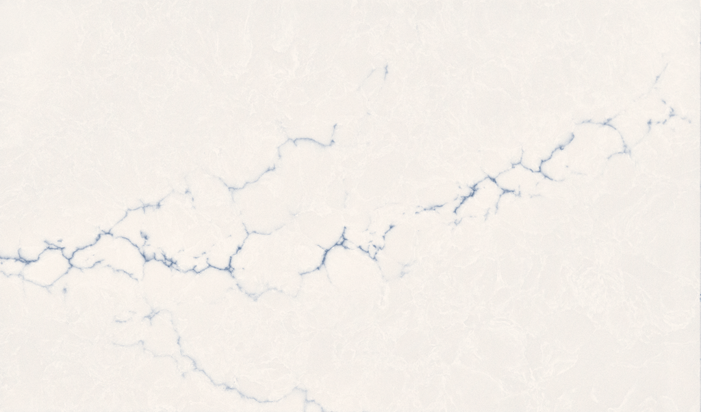 Elevate your interior design with the striking beauty of our latest quartz creation. This stunning surface features dramatic blue and grey veining that runs across a light grey base. This design creates a mesmerizing visual effect that's both bold and refined. The subtle white veining adds an extra layer of depth, making it a true statement piece in any room.