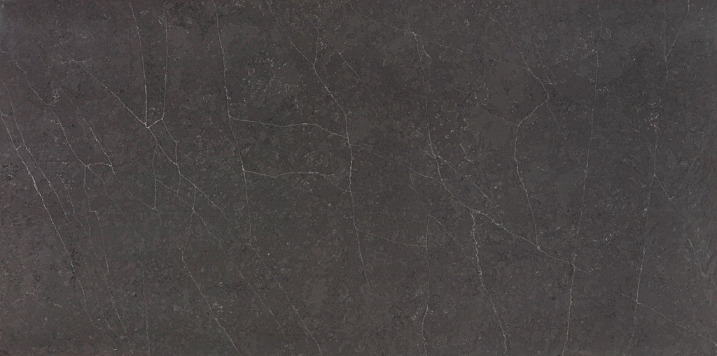 Quartzite-inspired quartz, featuring a two-toned dark grey background with subtle white veining. Petra Grigio embodies this vibrancy of darkness, expressing threads of subtle white across a rich two-toned grey background. Complex patterns echo the intricate wave formations etched into pahoehoe lava over thousands of years, and the glow of their smooth surface in the fire of the setting sun. The aesthetic embodies a vitality of shadow, and timeless spark of molten fire.