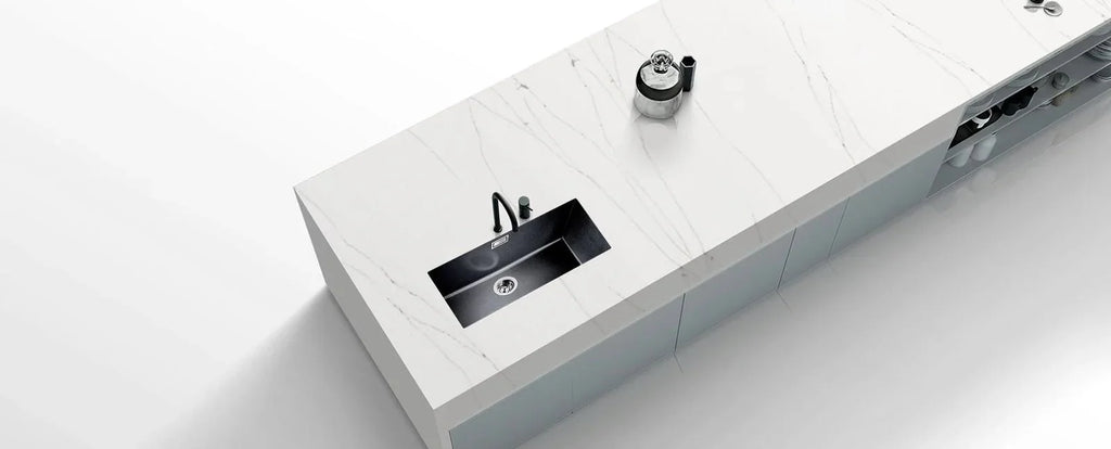Discover the perfect combination of elegance and modernity with Raphael Stone Quartz River Gold. This luxurious quartz surface pairs the timeless grace of Calacatta Lincoln with soft gold veining, creating a unique and sophisticated look. Its clean white base is brought to life by subtle veins in warm grey and brushed gold, reminiscent of mountain-carved marble and the warmth of sunlight.