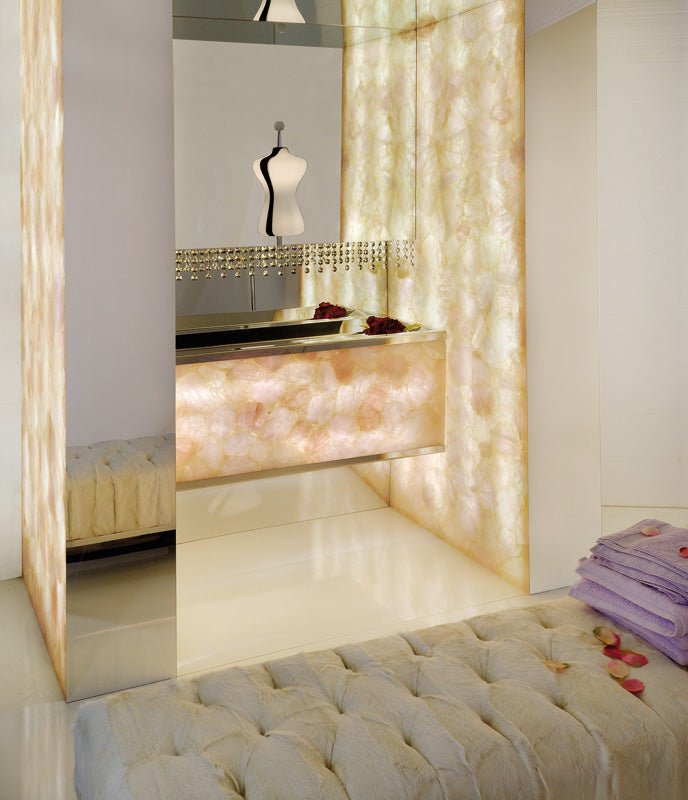 Rose Quartz gemstone slabs exude a delicate beauty and soothing energy, making them a popular choice for adding warmth and elegance to interior spaces. Crafted from the semi-precious stone Rose Quartz, these slabs showcase a soft pink hue with subtle variations in tone, often accented by natural veining and translucency. With its gentle appearance and calming properties, Rose Quartz creates a serene and inviting atmosphere wherever it is used.