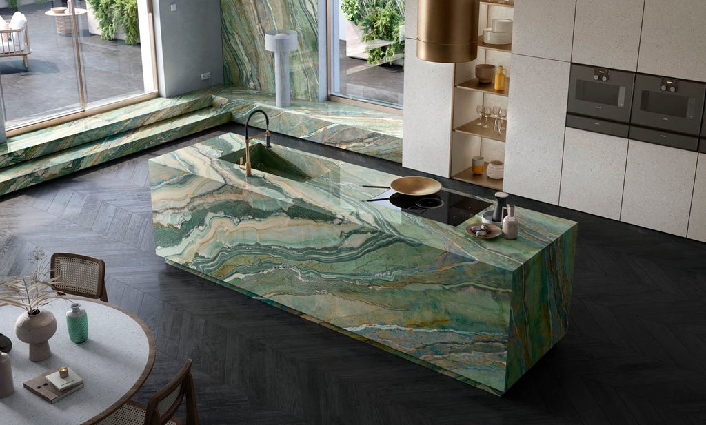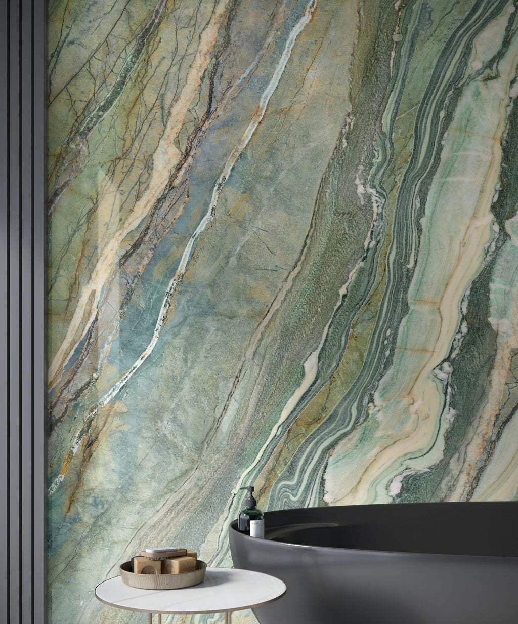 Experience the elegance of Royal Peacock, a luxurious porcelain slab from Infinity Surfaces. Inspired by the opulence of the majestic peacock's tail, this premium product boasts a captivating blend of greens, browns, and greys with subtle hints of teal. The fluid, linear patterns add movement and sophistication to any space.
