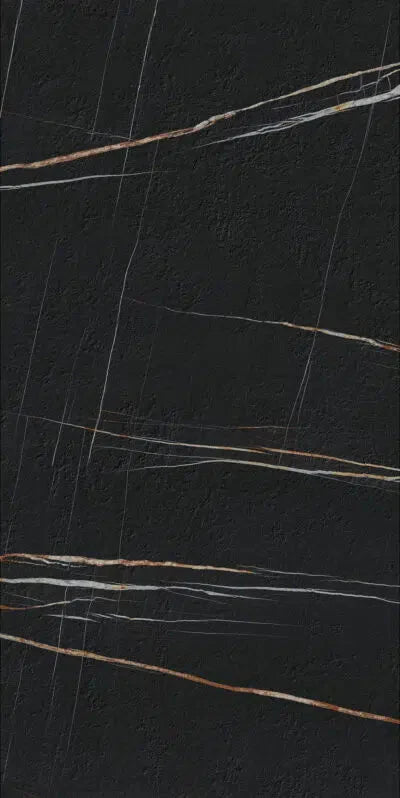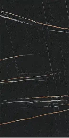 Laminam Sahara Noir Extra is a luxurious surface that captures the dramatic elegance of Sahara Noir marble. This striking slab features a deep black background adorned with bold, contrasting veins of gold and white, creating a mesmerizing pattern that exudes opulence and sophistication.