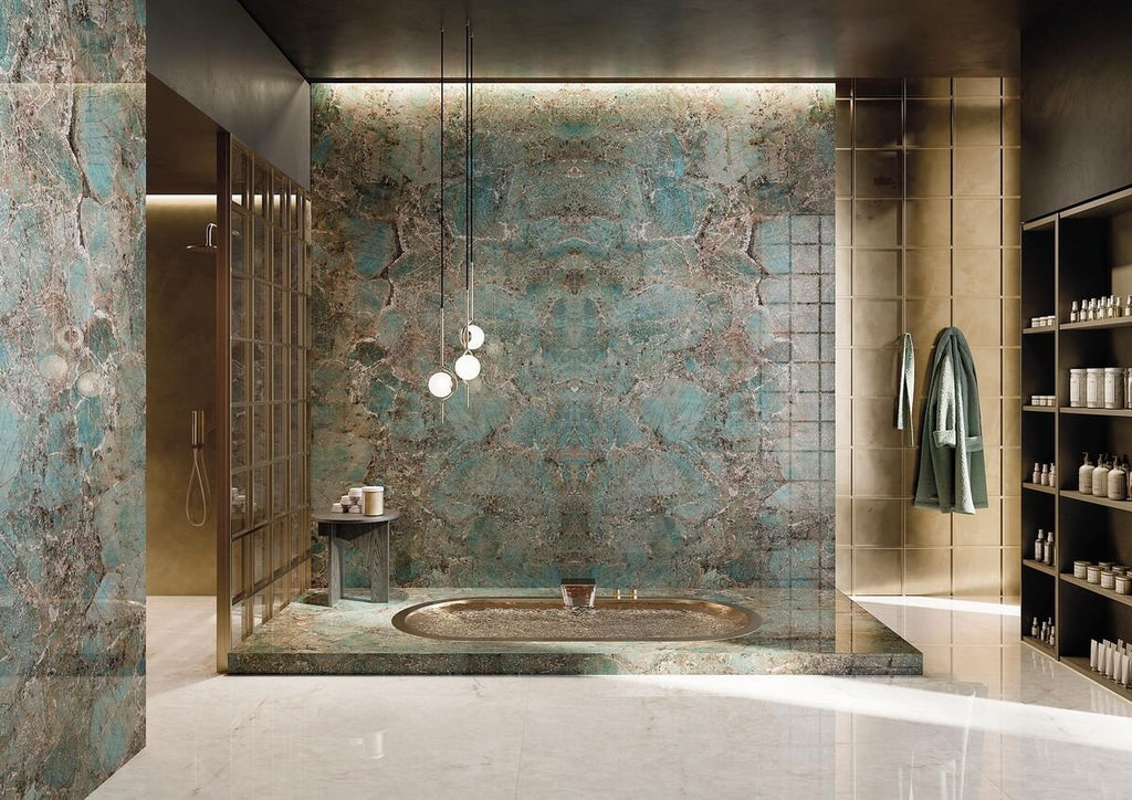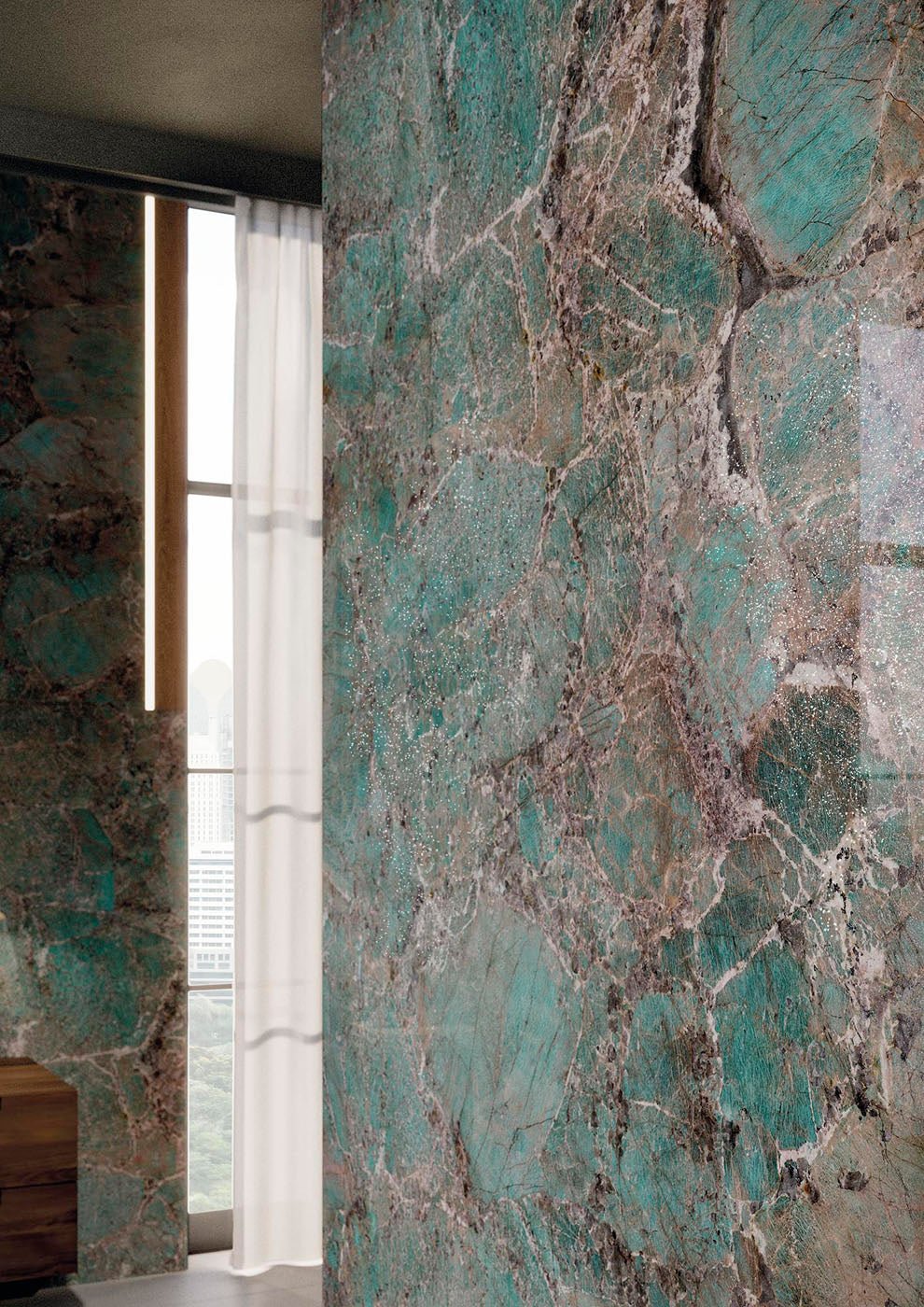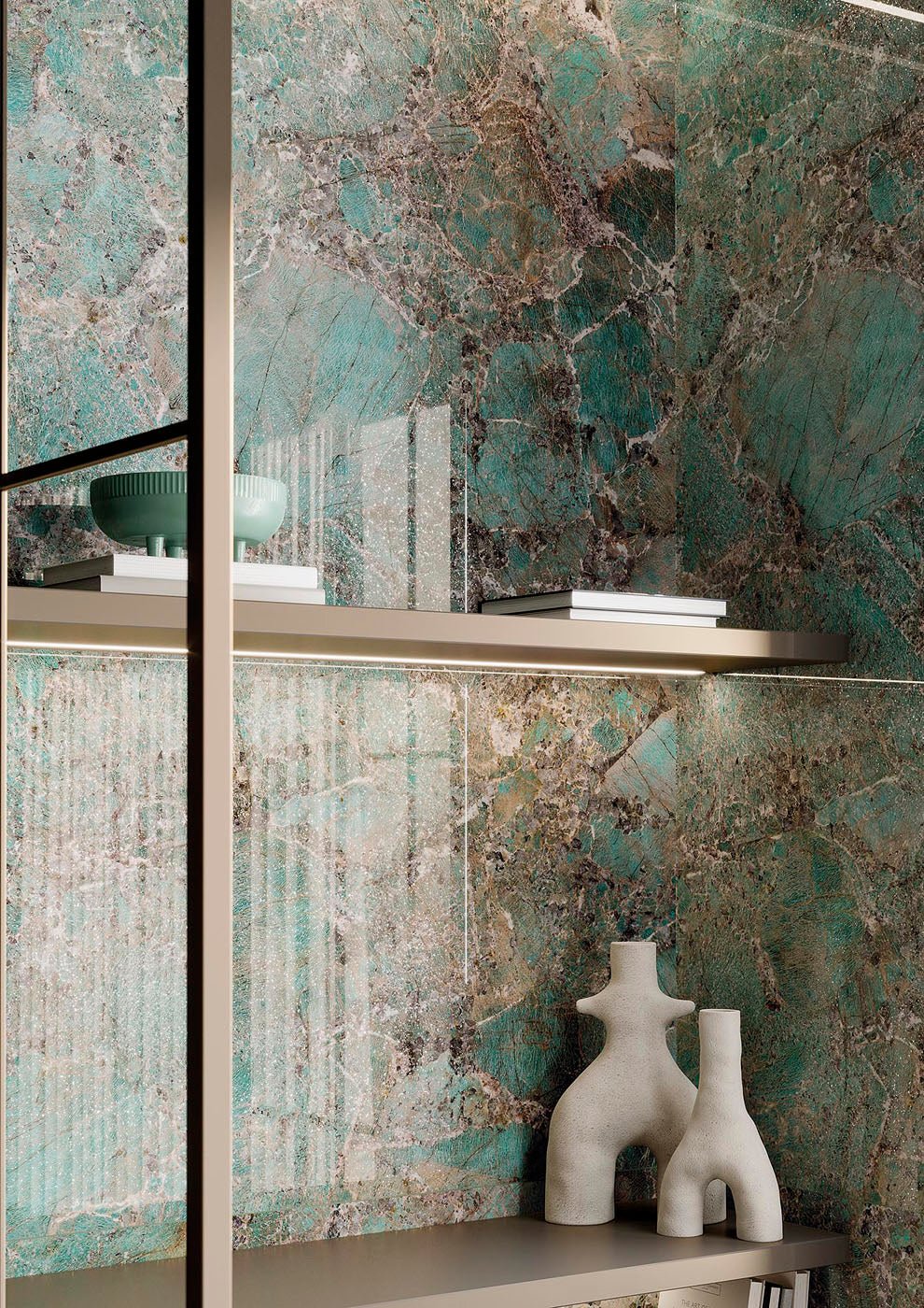 Indulge in luxury with Santos Infinity, a premium porcelain slab inspired by rare Brazilian stone. The exquisite shades of teal and iridescent finish create a unique and decorative surface, while silvery specks add a touch of graphic depth. Elevate your interiors with this exclusive choice.