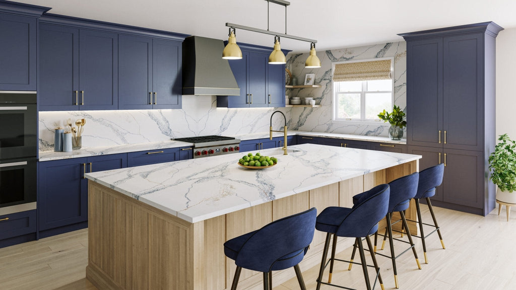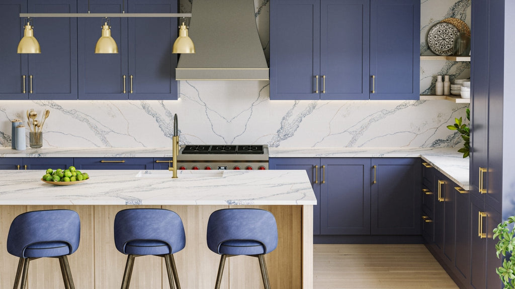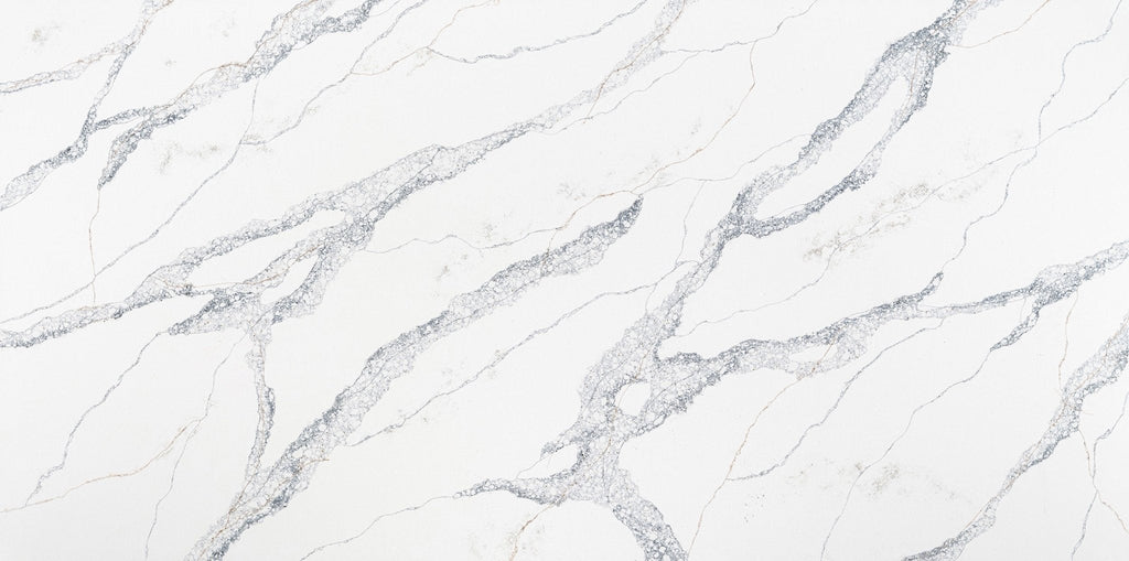 Calacatta marble-inspired quartz, featuring a bright white background with bold, dynamic blue, brown and rust veining.