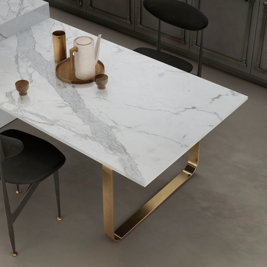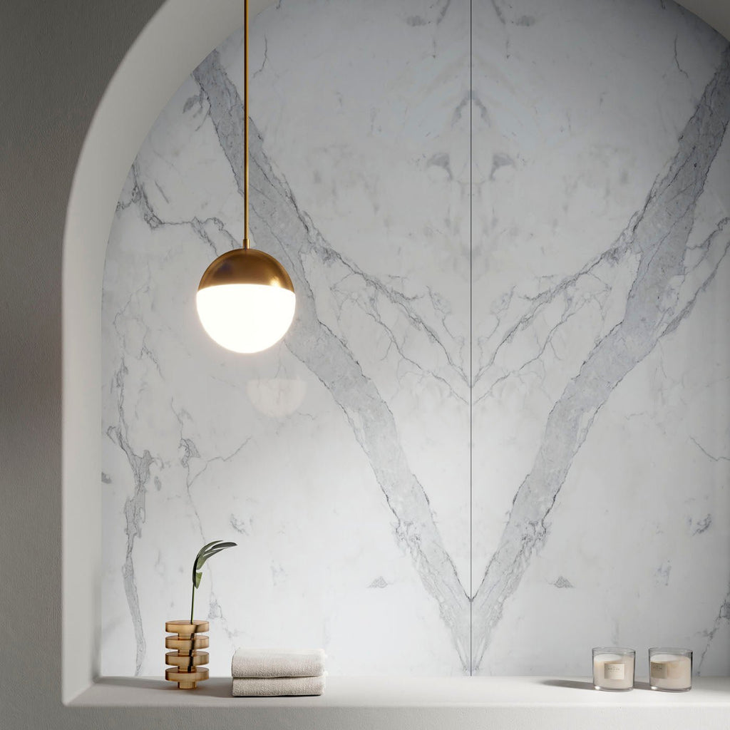 Statuario Principe by Infinity Surfaces is a premium porcelain slab that emulates the elegance of natural Statuario marble. It features a pristine white background adorned with distinctive grey veining, making it a versatile choice for various interior applications.