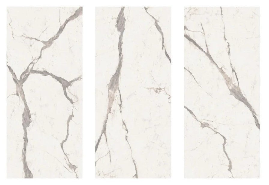 Statuario Versilia Raphael Porcelain is a refined, warm-toned marble-look porcelain featuring broad, elegant taupe-grey and soft gold veining set against a warm white canvas. This sophisticated large-format slab blends cozy marble character with the scale and resilience of porcelain—ideal for luxury interiors and architecturally bold spaces.