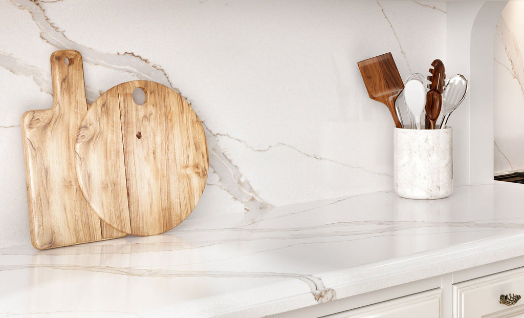 Experience the allure of Sunrise Vista Vadara's Calacatta marble-inspired quartz with its white background adorned by striking undertones of gold and grey. Immerse yourself in its grandeur and unlock the secrets of its storied past, a true legacy waiting to be discovered. The warm, sprawling veining evokes the sun's caress on towering mesas and the ethereal shadows that bring this ancient land to life.