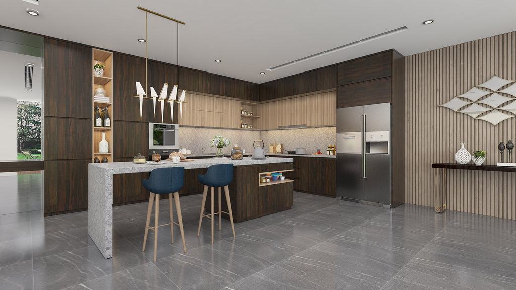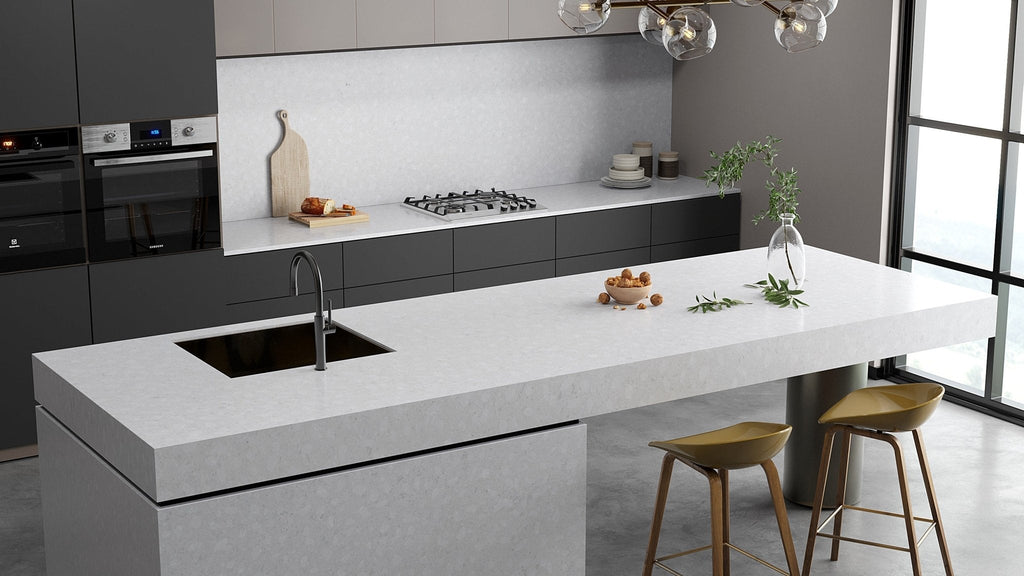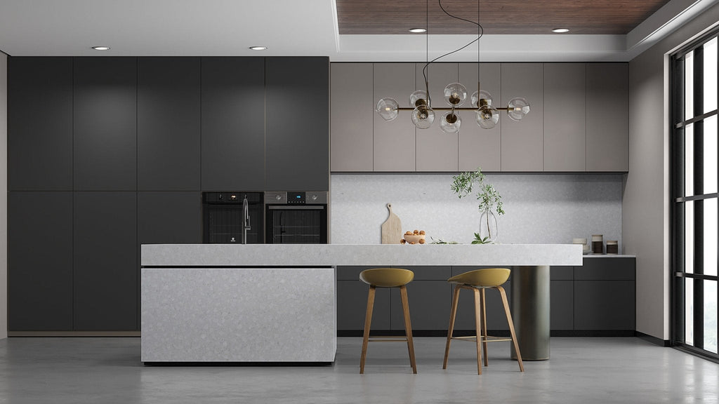 Vicostone Terreno is like a groovy terrazzo from the past, blending medium white chunks with a chill gray backdrop.