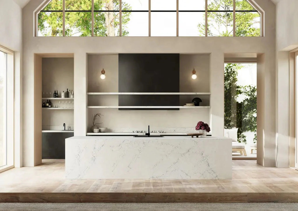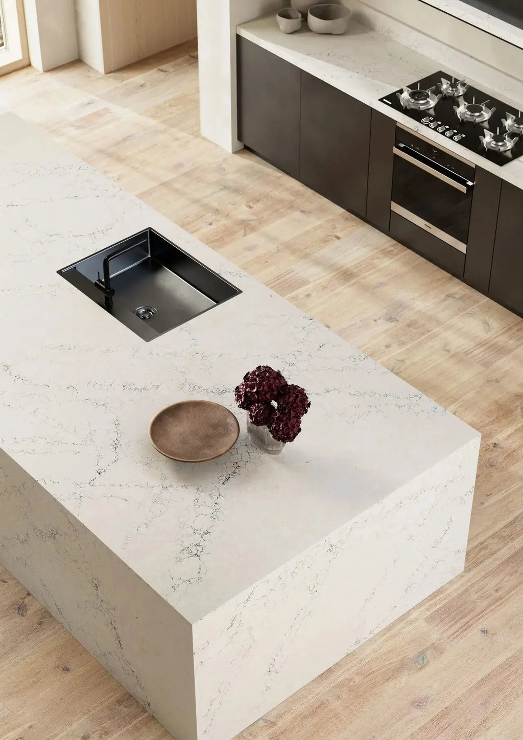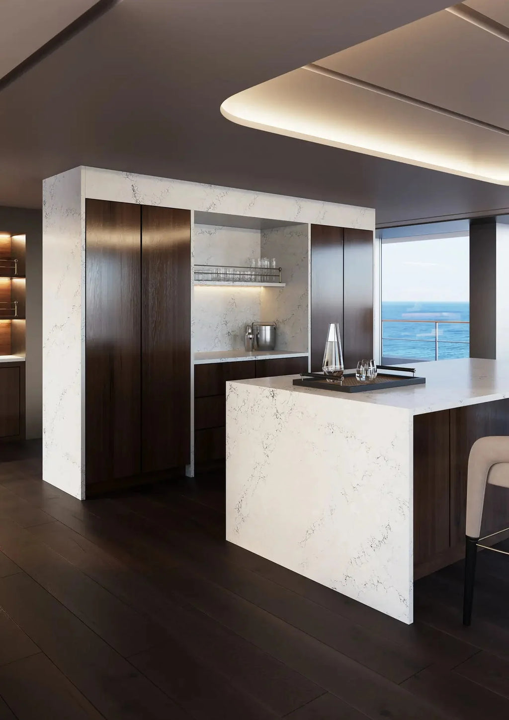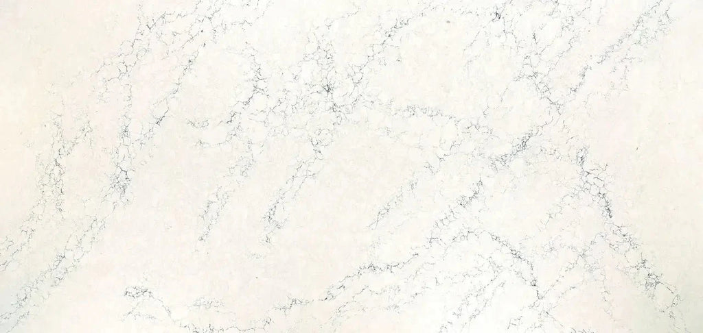 Travella™ by Cambria is a distinguished quartz surface that artfully combines creamy, cloud-like tones with delicate navy blue veining, evoking the serene imagery of meandering rivers across a pristine landscape. This design offers a sophisticated and tranquil aesthetic, making it a versatile choice for various interior applications.
