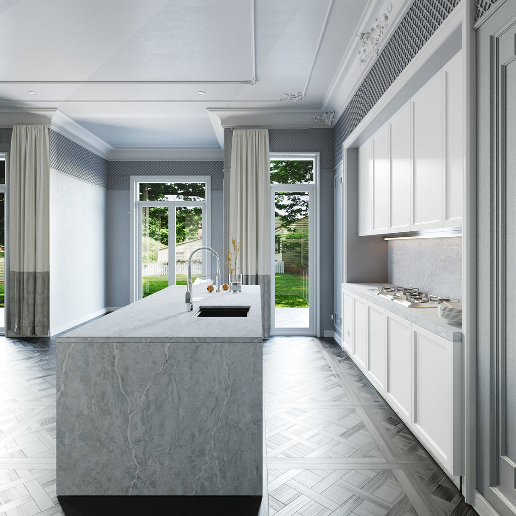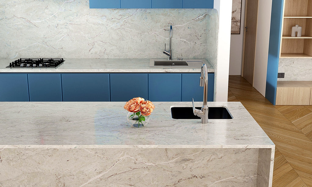 Unleashed as part of the Acqua series, Vicostone Verdelia® dazzles with delicate white veins dancing across a refreshingly verdant and refined backdrop, blending the natural allure of quartzite and the boldness of granite.