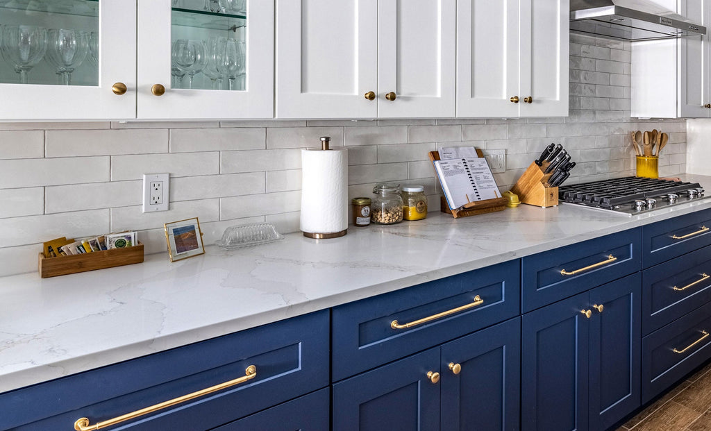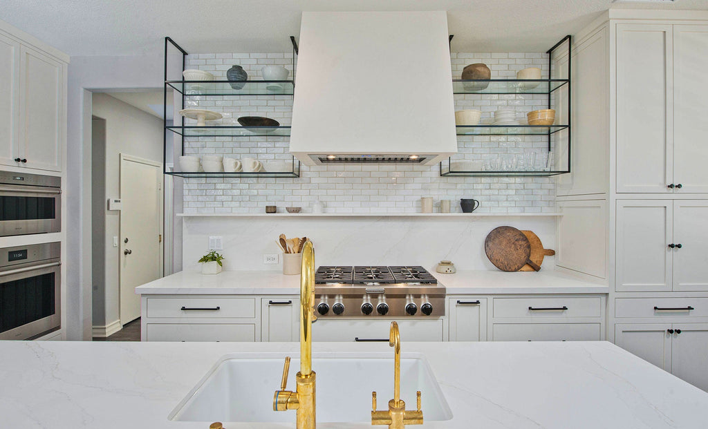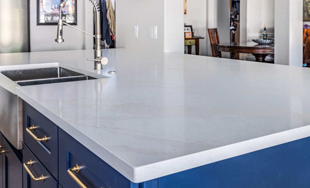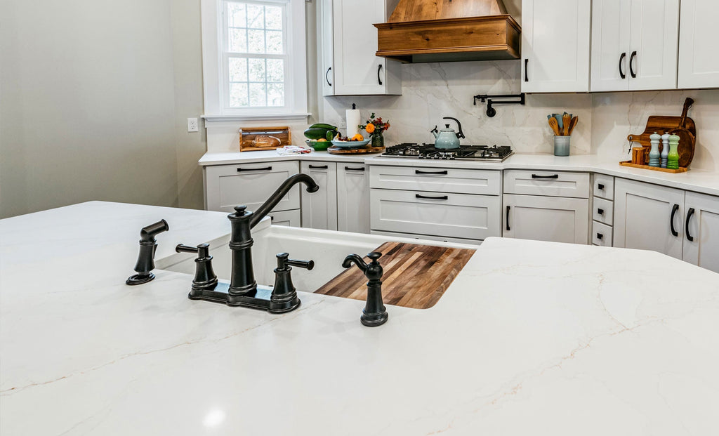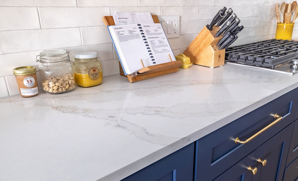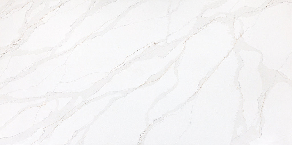 Calacatta marble-inspired quartz, featuring a white background with dynamic light grey and gold veining. We were inspired by sheets of light falling through the clouds, appearing like a gentle Aurora — a gift to those who pause for long enough to enjoy it. There’s a playful stillness to the twisting valleys and kaleidoscope of shade across the horizon which we paint through dynamic shadows of subtle veins against a cloudy white surface. White Aurora brings the same wonder of the amber mist to your design inviting you to lose yourself in a golden pause.