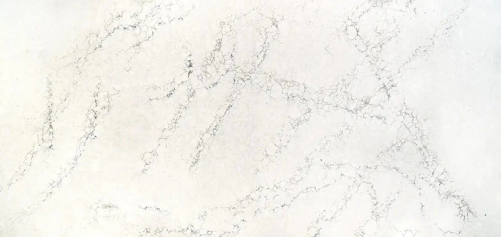 Whitendale features deep gray veins that intertwine and converge, forming intricate patterns that sprawl across a speckled cream backdrop, evocative of pebbles on a rugged coastline.
