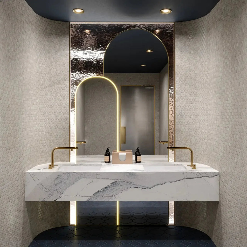 Experience the captivating textures of Windsor Steel Satin Ridge Cambria. This design is dynamic and balanced, with steel-toned colorways that create the illusion of motion. The steel alloy reflects sunlight and complements the warm honey sand and cool charcoal tones. Don't miss out on this stunning addition to your home.
