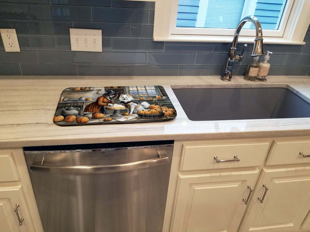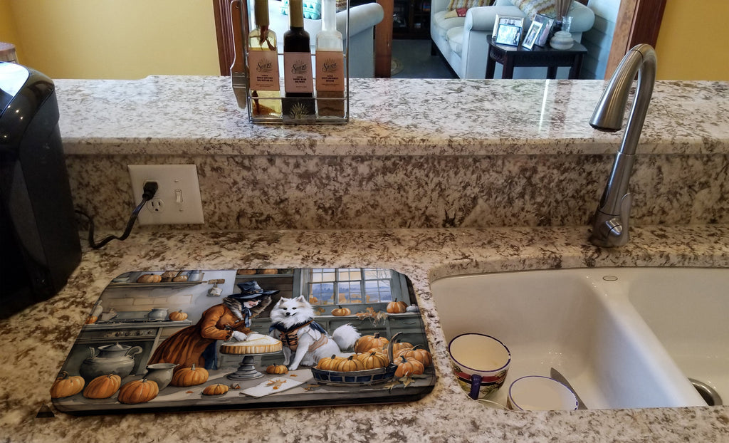 Dish Drying Mat featuring breed specific American Eskimo artwork. Celebrate Halloween with this Halloween Dish Drying Mat. Say goodbye to messy countertops and soggy dish towels with our innovative dish drying mat. Our high-quality dish drying pad is designed to keep your countertops dry while offering a stylish and efficient solution. Whether you're air drying dishes, glasses, stemware, silverware, pots, pans, bottles, or even fruits and vegetables, our dish mat is the perfect choice. The 14 inches x 22 inches size fits most counters and dish drying racks, and the non-slip design ensures stability. Made with water-absorbent polyester and a polyurethane foam insert, our dish drying mat is not only functional but also durable. It's machine washable and printed in the USA for long-lasting use. The beautiful artwork adds flair to your kitchen decor, making it a perfect housewarming gift or present for any occasion. Upgrade your kitchen experience with our absorbent and versatile dish drying mat.