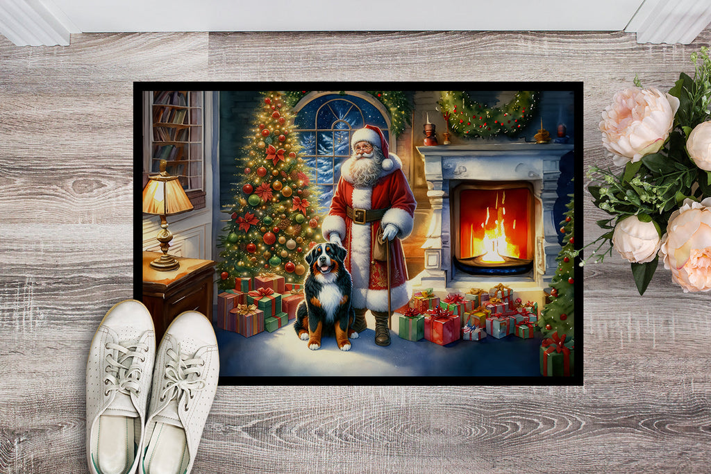 Decorate your space with our Christmas Bernese Mountain Dog artwork on a Doormat. Welcome your guests in style with our Artwork Door Mat, designed to withstand almost any weather condition. This mat, measuring approximately 24 by 36 inches, is held together by durable black binding tape. Its top layer, composed of polyester felt, is dyed with the eye-catching image you see on the mat. A few layers below provide the mat with stability, while its rubber bottom is stamped to help prevent slipping and ensures safety. Our mat works wonderfully as both an indoor or outdoor door mat. For cleaning, simply hose it off with water or use a power washer - no need for any cleaner that produces suds. Avoid scrubbing with a brush, instead, opt for the vacuum on floor setting. Designed manufactured and printed in the USA, this mat is a perfect addition to your porch, outdoor kitchen, entryway, or any indoor space. Its unique design makes it a charming decorative rug that greets your guests and adds a stylish touch to your home decor.