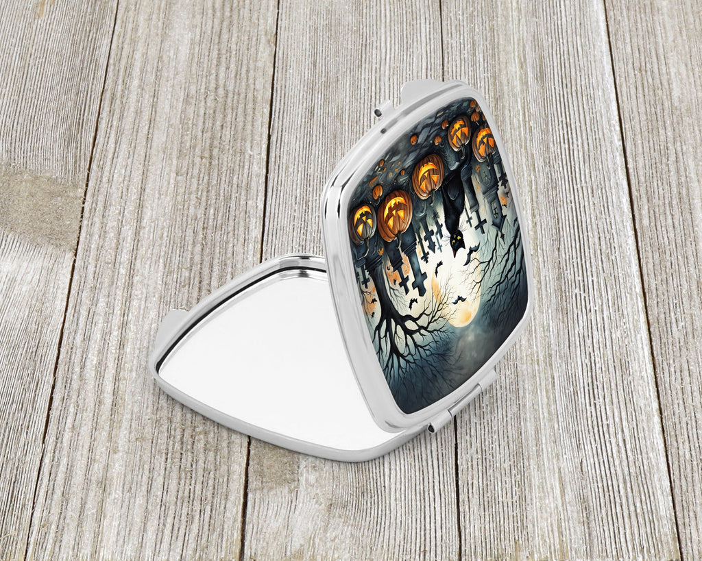 Decorate your space with our Halloween artwork on a Compact Mirror. Introducing our Square Compact Mirror, a blend of elegance, functionality, and compactness, perfect for on-the-go touch-ups. This Silvertone metal mirror, with dimensions of 2.75 inches x 3 inches x .3 inches, fits effortlessly into your purse, handbag, or pocket, ensuring that you can check your appearance anytime, anywhere. Our compact mirror stands out with its eye-catching artwork on the front, adding a dash of style to this practical accessory. It is more than just a mirror; it's a statement piece that reflects your personality and aesthetic. When opened, this compact reveals two mirrors inside, doubling your perspective for precise touch-ups. The Silvertone metal construction ensures durability while maintaining a lightweight feel, making it an ideal everyday carry item. Whether you're rushing to a meeting, prepping for a dinner date, or just need a quick check on your look, our Square Compact Mirror is your reliable companion. Experience the perfect blend of style and practicality with this must-have accessory.