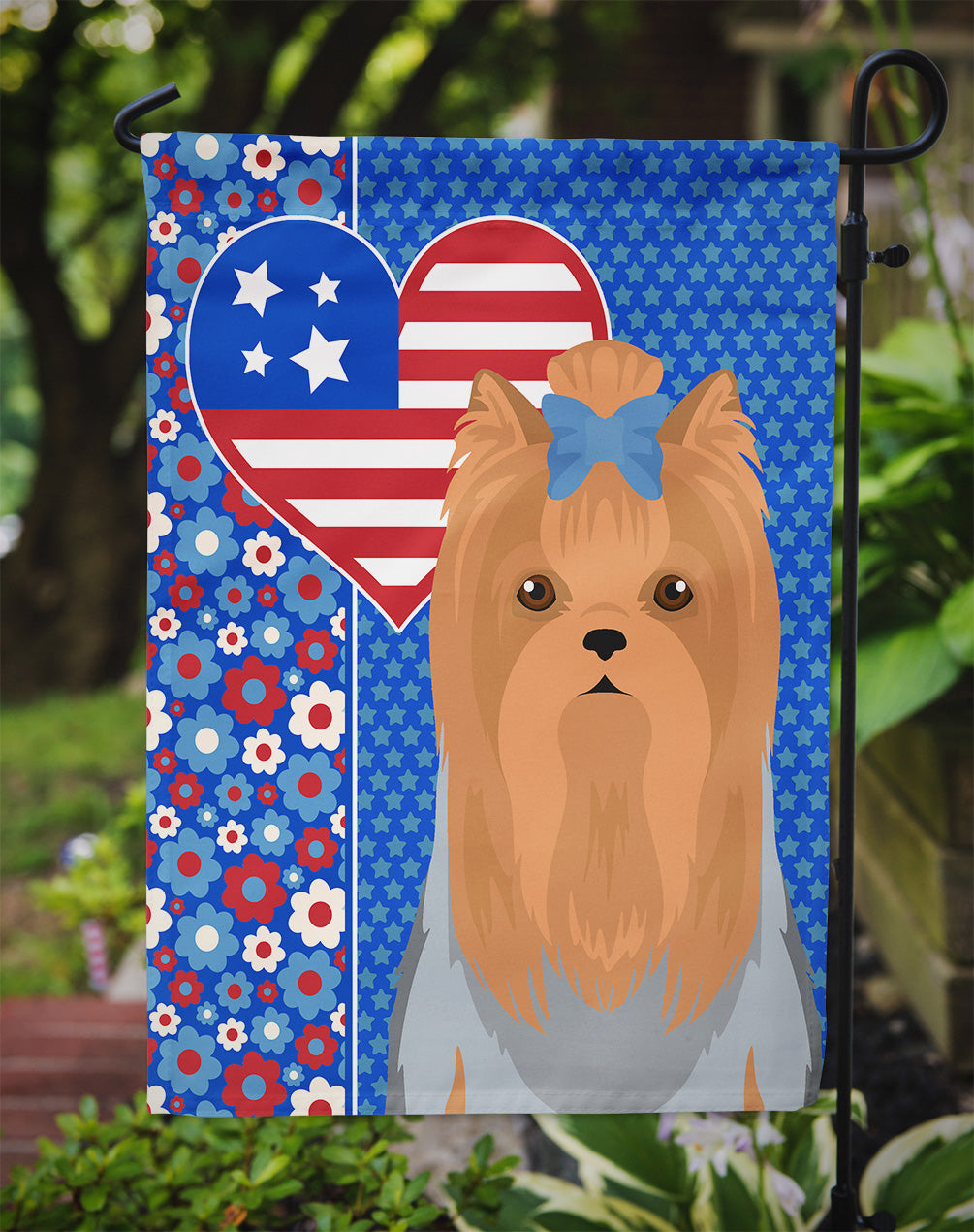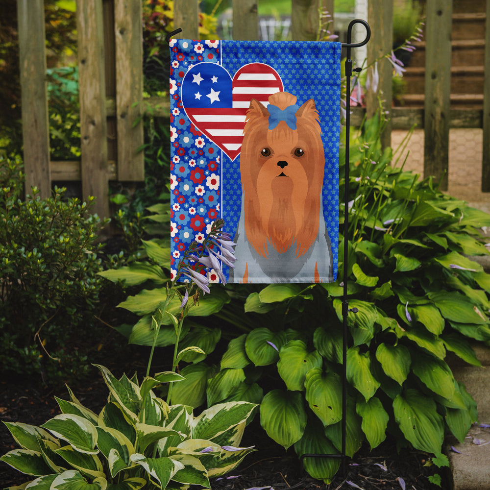 Decorate your space with our Yorkshire Terrier artwork on a Garden Flag. Enhance the beauty of your garden, patio, or yard with Caroline's Treasures Decorative Garden Flag, proudly made in the USA. Crafted from two pieces of thick, double-sided polyester fabric, this 2-ply garden flag is designed to withstand various weather conditions, making it water-resistant and weatherproof. Featuring correctly readable words on both sides, this garden flag offers a delightful visual experience from any angle. With its heavier weight, it stands out among other garden flags, ensuring stability and durability even in wind, rain, and snow. Measuring approximately 11 1/4 inches by 15 1/2 inches, this flag allows you to personalize your outdoor decor. It comes with a 1 1/2-inch sleeve sewn in, allowing easy attachment to any standard garden flag stand or garden size porch hanger (sold separately). Make a statement in your outdoor space with Caroline's Treasures Decorative Garden Flag, a vibrant and high-quality flag that adds color and personality to your surroundings. Proudly made in the USA, it's a symbol of quality craftsmanship and attention to detail.
