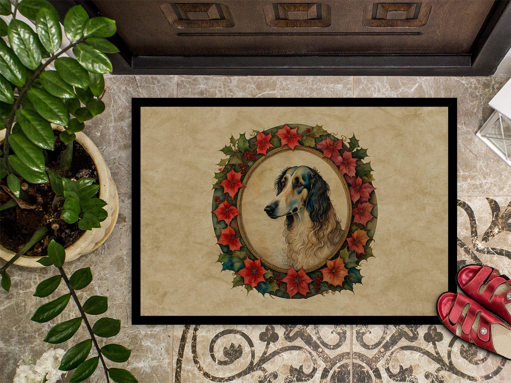 Decorate your space with our Christmas Borzoi artwork on a Doormat. Bring a bit of Winter into your home with a Winter Doormat. Welcome your guests in style with our Artwork Door Mat, designed to withstand almost any weather condition. This mat, measuring approximately 24 by 36 inches, is held together by durable black binding tape. Its top layer, composed of polyester felt, is dyed with the eye-catching image you see on the mat. A few layers below provide the mat with stability, while its rubber bottom is stamped to help prevent slipping and ensures safety. Our mat works wonderfully as both an indoor or outdoor door mat. For cleaning, simply hose it off with water or use a power washer - no need for any cleaner that produces suds. Avoid scrubbing with a brush, instead, opt for the vacuum on floor setting. Designed manufactured and printed in the USA, this mat is a perfect addition to your porch, outdoor kitchen, entryway, or any indoor space. Its unique design makes it a charming decorative rug that greets your guests and adds a stylish touch to your home decor.