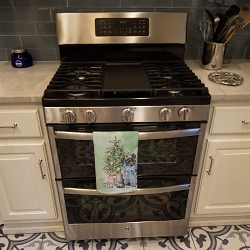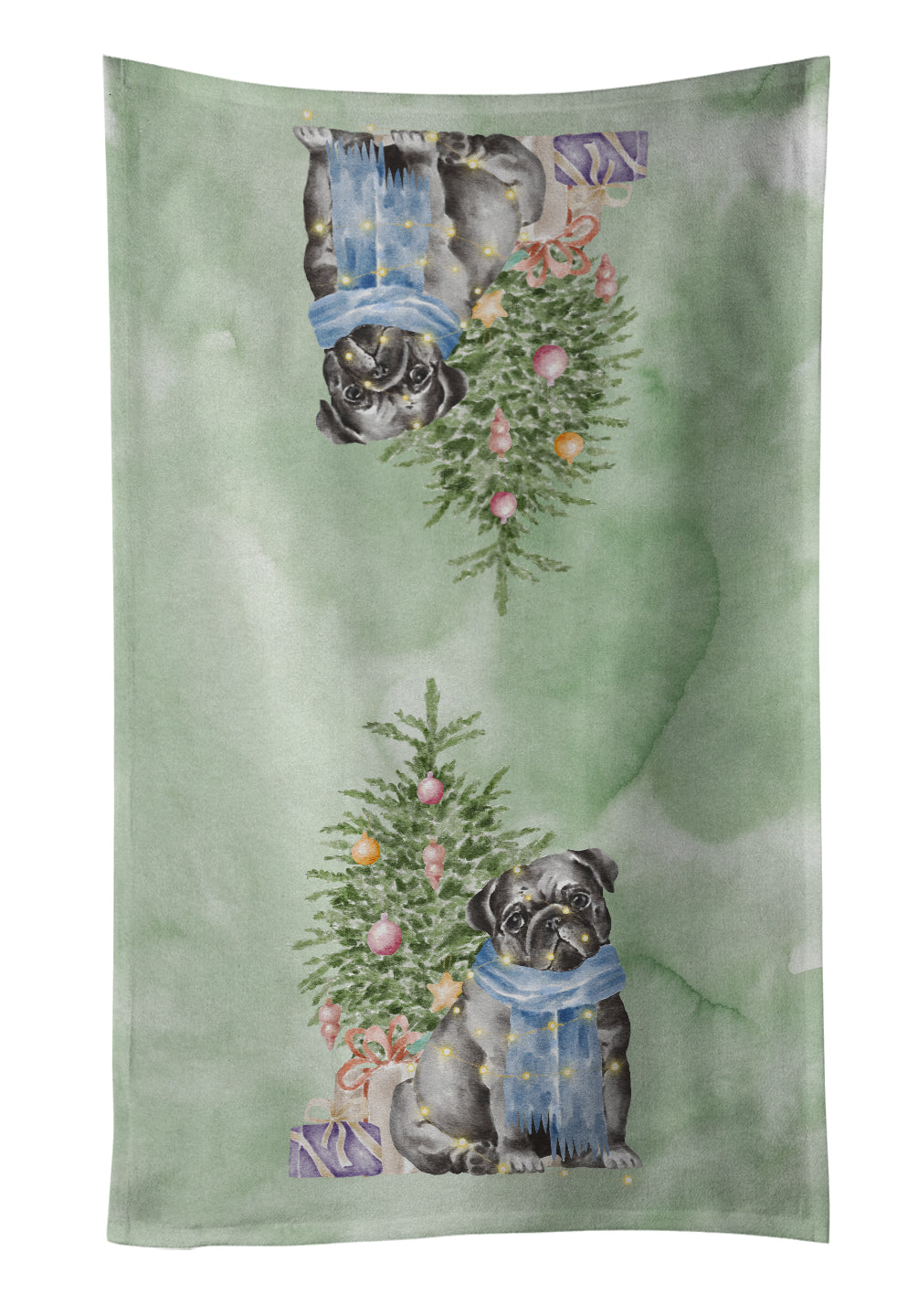 Decorate your space with our Christmas Pug artwork on a Kitchen Towel. Experience the perfect blend of aesthetic appeal and functional excellence with our Plush Velour Kitchen Towels. These are not your ordinary decorative kitchen towels that gather dust. Instead, they are designed to be as practical as they are stylish. The front layer of our towel is constructed from a minky plush polyester, known for its durability and color retention. Unlike conventional kitchen towels, the artwork on our towels is dyed directly into the fabric, ensuring vibrant colors that last. Polish your glassware to a brilliant sparkle using the plush front side of the towel. Flip to the back, crafted from 100% cotton terry loop, to exploit its exceptional absorbency for drying dishes or wiping down counters. Our kitchen towels redefine the concept of functional art, offering lasting quality that maintains the towel's shape over time. Measuring 15 inches by 25 inches and weighing 2.3 lbs per dozen, these towels deliver an overwhelming sensory experience with their soft, plush, and smooth texture. The edges are meticulously finished with binding, enhancing their durability and visual appeal. For your convenience, these towels are machine washable and can be dried on low heat. After the first wash, the top fabric becomes even softer and fluffier, eliminating the need for ironing. Treat your kitchen to the luxury and functionality it deserves with our plush velour kitchen towels.